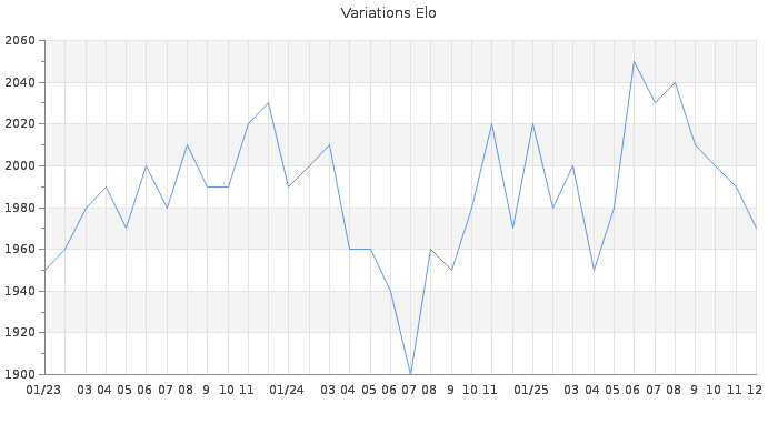 Date d'inscription : 11/03/06. Donateur pour EchecsEmail : Non ( Cliquez ici pour soutenir EchecsEmail. ) Elo non arrondi:1971.1 ( 141 sur 454 joueurs ) Nombre de victoires :4906 Nombre de nulles :614 Nombre de défaites :3915 Temps de réponse moyen par coup : 0J 5H 36M 35S ( Moyenne sur 3141 coups ). Rd ( Un petit rd indique un elo fiable ) : 50 Magic Elo:1714.89 Magic Rd : 282 Elo maximum atteint ( en étant classé ) :2140 Elo maximum atteint cette année :2070 Nombre coups joués : 319557 Inscrit dans l' équipe:Les Gens du Sud Classement coupe : 27 Points coupe : 2223.51 Classement Coupe Magic Chess : Inactif Points Coupe Magic Chess : 0 Tournoi échelle : Inactif. Tournois gagnés : 02/11/2025 : Cat 4 : Victoire dans le tournoi n°27150 17/06/2025 : Cat 4 : Victoire dans le tournoi n°26825 11/05/2025 : Cat 4 : Victoire dans le tournoi n°26735 08/04/2025 : Cat 3 : Premier au tournoi multi Saint-Valentin 2025 n°4 21/03/2025 : Cat 3 : Premier au tournoi multi Noël 2024 n°4 04/12/2024 : Cat 5 : Victoire dans le tournoi n°26252 21/05/2024 : Cat 4 : Victoire dans le tournoi n°25768 18/03/2024 : Cat 3 : Premier au tournoi multi Saint-Valentin 2024 n°4 11/12/2023 : Cat 3 : Premier au tournoi multi Halloween 2023 n°3 06/11/2023 : Cat 3 : Premier au tournoi multi Automne 2023 n°6 03/02/2023 : Cat 4 : Premier au tournoi multi Noël 2022 n°4 11/12/2022 : Cat 4 : Victoire dans le tournoi n°24474 08/07/2022 : Cat 4 : Victoire dans le tournoi n°24063 27/06/2022 : Cat 4 : Victoire dans le tournoi n°24006 26/04/2022 : Cat 3 : Premier au tournoi multi Printemps 2022 n°6 15/04/2022 : Cat 4 : Victoire dans le tournoi n°23723 02/05/2021 : Cat 4 : Victoire dans le tournoi n°22651 03/03/2021 : Cat 3 : Premier au tournoi multi Saint-Valentin 2021 n°4 28/02/2021 : Cat 4 : Victoire dans le tournoi n°22430 13/02/2021 : Cat 4 : Victoire dans le tournoi n°22325 06/02/2021 : Cat 4 : Victoire dans le tournoi n°22228 27/06/2020 : Cat 4 : Victoire dans le tournoi n°21431 29/08/2019 : Cat 4 : Victoire dans le tournoi n°20060 09/07/2019 : Cat 3 : Victoire dans le tournoi n°19852 27/02/2019 : Cat 4 : Victoire dans le tournoi n°19161 01/02/2019 : Cat 3 : Victoire dans le tournoi n°19217 04/03/2018 : Cat 4 : Victoire dans le tournoi n°17783 09/11/2017 : Cat 4 : Victoire dans le tournoi n°16934 04/10/2017 : Cat 4 : Victoire dans le tournoi n°16752 06/07/2017 : Cat 4 : Victoire dans le tournoi n°16528 11/03/2017 : Cat 4 : Victoire dans le tournoi n°16217 15/02/2017 : Cat 4 : Victoire dans le tournoi n°16139 13/02/2017 : Cat 3 : Victoire dans le tournoi n°16093 30/01/2017 : Cat 3 : Victoire dans le tournoi n°15940 02/10/2016 : Cat 4 : Victoire dans le tournoi n°15328 22/09/2016 : Cat 4 : Victoire dans le tournoi n°15365 11/09/2016 : Cat 4 : Victoire dans le tournoi n°15377 01/09/2016 : Cat 4 : Victoire dans le tournoi n°15120 27/06/2016 : Cat 4 : Victoire dans le tournoi n°14959 10/05/2016 : Cat 4 : Victoire dans le tournoi n°14779 28/04/2016 : Cat 4 : Victoire dans le tournoi n°14675 24/04/2016 : Cat 4 : Victoire dans le tournoi n°14634 23/04/2016 : Cat 4 : Victoire dans le tournoi n°14577 08/04/2016 : Cat 4 : Victoire dans le tournoi n°14379 17/11/2015 : Cat 4 : Victoire dans le tournoi n°18740 25/04/2015 : Cat 4 : Victoire dans le tournoi n°17223 09/04/2015 : Cat 4 : Victoire dans le tournoi n°17391 09/01/2015 : Cat 4 : Victoire dans le tournoi n°16764 25/09/2014 : Cat 4 : Victoire dans le tournoi n°15929 21/09/2014 : Cat 4 : Victoire dans le tournoi n°15607 02/08/2014 : Cat 4 : Victoire dans le tournoi n°15385 17/06/2014 : Cat 4 : Victoire dans le tournoi n°15469 12/06/2014 : Cat 4 : Victoire dans le tournoi n°15331 27/02/2014 : Cat 3 : Victoire dans le tournoi n°14589 11/02/2014 : Cat 4 : Victoire dans le tournoi n°14587 10/12/2013 : Cat 4 : Victoire dans le tournoi n°13870 01/12/2013 : Cat 4 : Victoire dans le tournoi n°13760 17/05/2013 : Cat 4 : Victoire dans le tournoi n°12394 02/05/2013 : Cat 4 : Victoire dans le tournoi n°12334 28/12/2012 : Cat 4 : Victoire dans le tournoi n°11469 19/11/2012 : Cat 3 : Victoire dans le tournoi n°11048 17/03/2012 : Cat 5 : Victoire dans le tournoi n°9892 19/02/2012 : Cat 4 : Victoire dans le tournoi n°9856 15/02/2012 : Cat 4 : Victoire dans le tournoi n°9630 12/06/2011 : Cat 4 : Victoire dans le tournoi n°8743 31/03/2011 : Cat 4 : Victoire dans le tournoi n°8457 25/01/2011 : Cat 4 : Victoire dans le tournoi n°7945 29/09/2010 : Cat 4 : Victoire dans le tournoi n°7758 23/03/2010 : Cat 4 : Victoire dans le tournoi n°7062 07/10/2009 : Cat 4 : Victoire dans le tournoi n°6287 14/07/2009 : Cat 3 : Victoire dans le tournoi n°6121 04/10/2008 : Cat 4 : Victoire dans le tournoi n°5109 30/09/2008 : Cat 4 : Victoire dans le tournoi n°5295 27/09/2008 : Cat 4 : Victoire dans le tournoi n°5217 31/03/2008 : Cat 3 : Victoire dans le tournoi n°4792 12/02/2008 : Cat 3 : Victoire dans le tournoi n°4589 09/06/2007 : Cat 2 : Victoire dans le tournoi n°3963 18/01/2007 : Cat 1 : Victoire dans le tournoi n°3748 08/10/2006 : Cat 0 : Premier au tournoi multi Automne 2006 n°11 Nombre de tournois gagnés :87