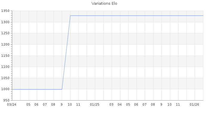 Date d'inscription : 25/03/24. Donateur pour EchecsEmail : Non ( Cliquez ici pour soutenir EchecsEmail. ) Elo non arrondi:1296.6 ( 457 sur 459 joueurs ) Nombre de victoires :0 Nombre de nulles :1 Nombre de défaites :1 Temps de réponse moyen par coup : 0J 1H 22M 15S ( Moyenne sur 0 coups ). Rd ( Un petit rd indique un elo fiable ) : 349 Magic Elo:1700 Magic Rd : 350 Elo maximum atteint ( en étant classé ) :0 Elo maximum atteint cette année :0 Nombre coups joués : 48 Classement coupe : Inactif Points coupe : 0 Classement Coupe Magic Chess : Inactif Points Coupe Magic Chess : 0 Tournoi échelle : Nombre de tournois gagnés :0
