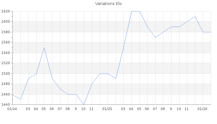 Date d'inscription : 21/01/24. Donateur pour EchecsEmail : Non ( Cliquez ici pour soutenir EchecsEmail. ) Elo non arrondi:1583.6 ( 344 sur 463 joueurs ) Nombre de victoires :72 Nombre de nulles :10 Nombre de défaites :109 Temps de réponse moyen par coup : 0J 11H 29M 51S ( Moyenne sur 148 coups ). Rd ( Un petit rd indique un elo fiable ) : 85 Elo maximum atteint ( en étant classé ) :1630 Elo maximum atteint cette année :1590 Nombre coups joués : 6554 Classement coupe : Inactif Points coupe : 0 Classement Coupe Magic Chess : Inactif Points Coupe Magic Chess : 0 Tournoi échelle : Tournois gagnés : 08/12/2024 : Cat 2 : Victoire dans le tournoi n°26247 Nombre de tournois gagnés :1
