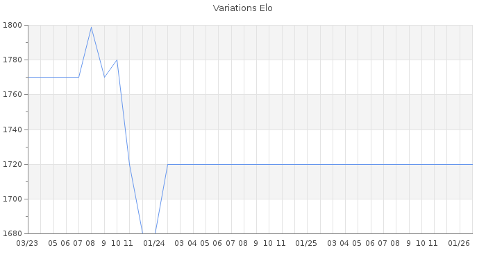 Date d'inscription : 16/05/11. Donateur pour EchecsEmail : Non ( Cliquez ici pour soutenir EchecsEmail. ) Elo non arrondi:1686.6 ( 316 sur 459 joueurs ) Nombre de victoires :142 Nombre de nulles :16 Nombre de défaites :91 Temps de réponse moyen par coup : 0J 14H 45M 50S ( Moyenne sur 0 coups ). Rd ( Un petit rd indique un elo fiable ) : 108 Magic Elo:1700 Magic Rd : 350 Elo maximum atteint ( en étant classé ) :1870 Elo maximum atteint cette année :0 Nombre coups joués : 8574 Classement coupe : Inactif Points coupe : 0 Classement Coupe Magic Chess : Inactif Points Coupe Magic Chess : 0 Tournoi échelle : Nombre de tournois gagnés :0