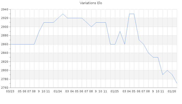 Date d'inscription : 30/09/13. Donateur pour EchecsEmail : Non ( Cliquez ici pour soutenir EchecsEmail. ) Elo non arrondi:2769.1 ( 9 sur 459 joueurs ) Nombre de victoires :1092 Nombre de nulles :341 Nombre de défaites :50 Temps de réponse moyen par coup : 0J 8H 35M 29S ( Moyenne sur 1465 coups ). Rd ( Un petit rd indique un elo fiable ) : 71 Magic Elo:1513.89 Magic Rd : 275 Elo maximum atteint ( en étant classé ) :2940 Elo maximum atteint cette année :2800 Nombre coups joués : 44986 Inscrit dans l' équipe:La Crim Team Classement coupe : 2 Points coupe : 22276.8 Classement Coupe Magic Chess : Inactif Points Coupe Magic Chess : 0 Tournoi échelle : Elite : 20 Tournois gagnés : 27/01/2026 : Cat 6 : Premier au tournoi multi Noël 2025 n°1 20/01/2026 : Cat 6 : Premier au tournoi multi Automne 2025 n°1 05/01/2026 : Cat 5 : Premier au tournoi multi Noël 2025 n°2 03/01/2026 : Cat 6 : Premier au tournoi multi Halloween 2025 n°1 29/11/2025 : Cat 6 : Victoire CC Sep25 Asc 15/11/2025 : Cat 5 : Premier au tournoi multi Halloween 2025 n°2 05/11/2025 : Cat 4 : Victoire CC Oct25 Asc 18/10/2025 : Cat 6 : Premier au tournoi multi Eté 2025 n°1 08/10/2025 : Cat 5 : Premier au tournoi multi Automne 2025 n°2 25/08/2025 : Cat 4 : Premier au tournoi multi Eté 2025 n°2 16/08/2025 : Cat 4 : Victoire CC Aut25 Asc 25/06/2025 : Cat 6 : Victoire CC Juin25 Asc 30/05/2025 : Cat 5 : Victoire CC Mai25 Asc 21/05/2025 : Cat 5 : Premier au tournoi multi Printemps 2025 n°1 15/05/2025 : Cat 10 : Victoire CC Finale 2024 27/04/2025 : Cat 5 : Victoire CC Avr25 Asc 25/04/2025 : Cat 6 : Premier au tournoi multi Saint-Valentin 2025 n°1 23/04/2025 : Cat 5 : Victoire CC Mar25 Asc 11/04/2025 : Cat 5 : Premier au tournoi multi Printemps 2025 n°2 09/04/2025 : Cat 5 : Premier au tournoi multi Noël 2024 n°1 05/03/2025 : Cat 5 : Victoire CC Fev25 Asc 04/03/2025 : Cat 5 : Premier au tournoi multi Saint-Valentin 2025 n°2 28/02/2025 : Cat 9 : Victoire CC Automne 2024 12/02/2025 : Cat 6 : Victoire CC Jan25 30/01/2025 : Cat 7 : Premier au tournoi multi Halloween 2024 n°1 28/01/2025 : Cat 5 : Premier au tournoi multi Noël 2024 n°2 20/01/2025 : Cat 6 : Victoire CC Dec24 05/12/2024 : Cat 5 : Premier au tournoi multi Halloween 2024 n°2 28/11/2024 : Cat 7 : Victoire CC Aut24 Asc 13/09/2024 : Cat 6 : Premier au tournoi multi Eté 2024 n°1 16/07/2024 : Cat 5 : Premier au tournoi multi Eté 2024 n°2 09/06/2024 : Cat 6 : Premier au tournoi multi Saint-Valentin 2024 n°1 13/05/2024 : Cat 6 : Premier au tournoi multi Printemps 2024 n°1 05/05/2024 : Cat 5 : Victoire CC Fev24 Asc 01/05/2024 : Cat 5 : Premier au tournoi multi Printemps 2024 n°2 12/04/2024 : Cat 4 : Premier au tournoi multi Saint-Valentin 2024 n°2 02/03/2024 : Cat 5 : Premier au tournoi multi Noël 2023 n°1 30/01/2024 : Cat 5 : Premier au tournoi multi Automne 2023 n°1 13/01/2024 : Cat 5 : Premier au tournoi multi Noël 2023 n°2 03/01/2024 : Cat 6 : Victoire CC Aut23 Asc 21/12/2023 : Cat 5 : Premier au tournoi multi Halloween 2023 n°1 19/12/2023 : Cat 5 : Victoire CC Nov23 Asc 14/12/2023 : Cat 5 : Victoire CC Dec23 Asc 05/12/2023 : Cat 5 : Premier au tournoi multi Automne 2023 n°2 18/11/2023 : Cat 5 : Premier au tournoi multi Halloween 2023 n°2 09/11/2023 : Cat 5 : Victoire CC Oct23 Asc 01/11/2023 : Cat 4 : Victoire CC Sep23 Asc 02/10/2023 : Cat 9 : Victoire CC Printemps 2023 13/09/2023 : Cat 5 : Premier au tournoi multi Eté 2023 n°1 28/07/2023 : Cat 5 : Victoire CC Juil23 Asc 16/07/2023 : Cat 5 : Premier au tournoi multi Eté 2023 n°2 13/07/2023 : Cat 5 : Victoire CC Juin23 01/07/2023 : Cat 6 : Premier au tournoi multi Printemps 2023 n°1 20/06/2023 : Cat 5 : Victoire CC Mai23 Asc 15/06/2023 : Cat 5 : Victoire CC Avr23 Asc 20/05/2023 : Cat 4 : Premier au tournoi multi Printemps 2023 n°2 08/05/2023 : Cat 4 : Victoire CC Mar23 Asc 21/04/2023 : Cat 5 : Premier au tournoi multi Saint-Valentin 2023 n°2 21/03/2023 : Cat 5 : Victoire CC Fev23 Asc 18/03/2023 : Cat 7 : Premier au tournoi multi Noël 2022 n°1 05/02/2023 : Cat 5 : Victoire CC Dec22 Asc 26/01/2023 : Cat 5 : Premier au tournoi multi Noël 2022 n°2 19/12/2022 : Cat 5 : Premier au tournoi multi Halloween 2022 n°2 25/10/2022 : Cat 9 : Victoire CC Printemps 2022 21/10/2022 : Cat 5 : Premier au tournoi multi Automne 2022 n°2 20/10/2022 : Cat 6 : Victoire CC Mai22 Asc 07/10/2022 : Cat 5 : Premier au tournoi multi Printemps 2022 n°1 01/10/2022 : Cat 9 : Victoire CC Ete 2021 19/09/2022 : Cat 6 : Victoire CC Juin22 Asc 19/09/2022 : Cat 6 : Victoire CC Juin22 Asc 27/06/2022 : Cat 7 : Victoire CC Avr22 20/06/2022 : Cat 6 : Premier au tournoi multi Saint-Valentin 2022 n°1 10/04/2022 : Cat 6 : Premier au tournoi multi Noël 2021 n°1 09/04/2022 : Cat 5 : Premier au tournoi multi Printemps 2022 n°2 08/04/2022 : Cat 5 : Victoire CC Mar22 Asc 08/04/2022 : Cat 4 : Premier au tournoi multi Saint-Valentin 2022 n°2 25/03/2022 : Cat 5 : Victoire CC Fev22 Asc 21/03/2022 : Cat 7 : Victoire CC Avr21 Asc 20/03/2022 : Cat 7 : Premier au tournoi multi Halloween 2021 n°1 27/01/2022 : Cat 7 : Victoire CC Nov21 Asc 23/01/2022 : Cat 5 : Premier au tournoi multi Noël 2021 n°2 24/12/2021 : Cat 6 : Victoire CC Dec21 Asc 19/12/2021 : Cat 6 : Victoire CC Aut21 Asc 14/12/2021 : Cat 10 : Victoire CC Finale 2020 24/11/2021 : Cat 5 : Premier au tournoi multi Halloween 2021 n°2 19/11/2021 : Cat 5 : Victoire CC Oct21 Asc 26/08/2021 : Cat 5 : Victoire CC Juil21 09/08/2021 : Cat 5 : Premier au tournoi multi Printemps 2021 n°1 12/06/2021 : Cat 6 : Premier au tournoi multi Noël 2020 n°1 22/04/2021 : Cat 6 : Premier au tournoi multi Saint-Valentin 2021 n°1 18/04/2021 : Cat 5 : Premier au tournoi multi Printemps 2021 n°2 26/02/2021 : Cat 5 : Premier au tournoi multi Saint-Valentin 2021 n°2 20/02/2021 : Cat 7 : Premier au tournoi multi Halloween 2020 n°1 16/02/2021 : Cat 5 : Victoire CC Sep20 Asc 29/01/2021 : Cat 5 : Victoire CC Nov20 Asc 10/01/2021 : Cat 5 : Premier au tournoi multi Noël 2020 n°2 10/12/2020 : Cat 6 : Pr