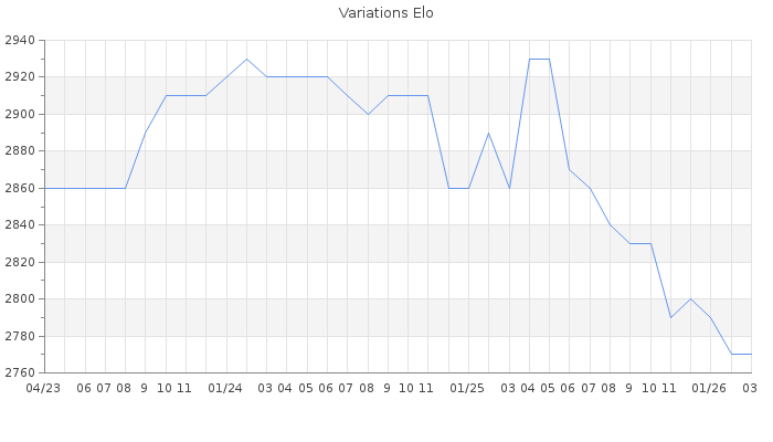 Date d'inscription : 30/09/13. Donateur pour EchecsEmail : Non ( Cliquez ici pour soutenir EchecsEmail. ) Elo non arrondi:2766.2 ( 9 sur 447 joueurs ) Nombre de victoires :1102 Nombre de nulles :345 Nombre de défaites :50 Temps de réponse moyen par coup : 0J 9H 1M 5S ( Moyenne sur 1335 coups ). Rd ( Un petit rd indique un elo fiable ) : 65 Magic Elo:1513.89 Magic Rd : 275 Elo maximum atteint ( en étant classé ) :2940 Elo maximum atteint cette année :2800 Nombre coups joués : 45462 Inscrit dans l' équipe:La Crim Team Classement coupe : 2 Points coupe : 23230.2 Classement Coupe Magic Chess : Inactif Points Coupe Magic Chess : 0 Tournoi échelle : Elite : 19 Tournois gagnés : 22/02/2026 : Cat 5 : Victoire CC Fev26 Asc 17/02/2026 : Cat 7 : Victoire CC Nov25 27/01/2026 : Cat 6 : Premier au tournoi multi Noël 2025 n°1 20/01/2026 : Cat 6 : Premier au tournoi multi Automne 2025 n°1 05/01/2026 : Cat 5 : Premier au tournoi multi Noël 2025 n°2 03/01/2026 : Cat 6 : Premier au tournoi multi Halloween 2025 n°1 29/11/2025 : Cat 6 : Victoire CC Sep25 Asc 15/11/2025 : Cat 5 : Premier au tournoi multi Halloween 2025 n°2 05/11/2025 : Cat 4 : Victoire CC Oct25 Asc 18/10/2025 : Cat 6 : Premier au tournoi multi Eté 2025 n°1 08/10/2025 : Cat 5 : Premier au tournoi multi Automne 2025 n°2 25/08/2025 : Cat 4 : Premier au tournoi multi Eté 2025 n°2 16/08/2025 : Cat 4 : Victoire CC Aut25 Asc 25/06/2025 : Cat 6 : Victoire CC Juin25 Asc 30/05/2025 : Cat 5 : Victoire CC Mai25 Asc 21/05/2025 : Cat 5 : Premier au tournoi multi Printemps 2025 n°1 15/05/2025 : Cat 10 : Victoire CC Finale 2024 27/04/2025 : Cat 5 : Victoire CC Avr25 Asc 25/04/2025 : Cat 6 : Premier au tournoi multi Saint-Valentin 2025 n°1 23/04/2025 : Cat 5 : Victoire CC Mar25 Asc 11/04/2025 : Cat 5 : Premier au tournoi multi Printemps 2025 n°2 09/04/2025 : Cat 5 : Premier au tournoi multi Noël 2024 n°1 05/03/2025 : Cat 5 : Victoire CC Fev25 Asc 04/03/2025 : Cat 5 : Premier au tournoi multi Saint-Valentin 2025 n°2 28/02/2025 : Cat 9 : Victoire CC Automne 2024 12/02/2025 : Cat 6 : Victoire CC Jan25 30/01/2025 : Cat 7 : Premier au tournoi multi Halloween 2024 n°1 28/01/2025 : Cat 5 : Premier au tournoi multi Noël 2024 n°2 20/01/2025 : Cat 6 : Victoire CC Dec24 05/12/2024 : Cat 5 : Premier au tournoi multi Halloween 2024 n°2 28/11/2024 : Cat 7 : Victoire CC Aut24 Asc 13/09/2024 : Cat 6 : Premier au tournoi multi Eté 2024 n°1 16/07/2024 : Cat 5 : Premier au tournoi multi Eté 2024 n°2 09/06/2024 : Cat 6 : Premier au tournoi multi Saint-Valentin 2024 n°1 13/05/2024 : Cat 6 : Premier au tournoi multi Printemps 2024 n°1 05/05/2024 : Cat 5 : Victoire CC Fev24 Asc 01/05/2024 : Cat 5 : Premier au tournoi multi Printemps 2024 n°2 12/04/2024 : Cat 4 : Premier au tournoi multi Saint-Valentin 2024 n°2 02/03/2024 : Cat 5 : Premier au tournoi multi Noël 2023 n°1 30/01/2024 : Cat 5 : Premier au tournoi multi Automne 2023 n°1 13/01/2024 : Cat 5 : Premier au tournoi multi Noël 2023 n°2 03/01/2024 : Cat 6 : Victoire CC Aut23 Asc 21/12/2023 : Cat 5 : Premier au tournoi multi Halloween 2023 n°1 19/12/2023 : Cat 5 : Victoire CC Nov23 Asc 14/12/2023 : Cat 5 : Victoire CC Dec23 Asc 05/12/2023 : Cat 5 : Premier au tournoi multi Automne 2023 n°2 18/11/2023 : Cat 5 : Premier au tournoi multi Halloween 2023 n°2 09/11/2023 : Cat 5 : Victoire CC Oct23 Asc 01/11/2023 : Cat 4 : Victoire CC Sep23 Asc 02/10/2023 : Cat 9 : Victoire CC Printemps 2023 13/09/2023 : Cat 5 : Premier au tournoi multi Eté 2023 n°1 28/07/2023 : Cat 5 : Victoire CC Juil23 Asc 16/07/2023 : Cat 5 : Premier au tournoi multi Eté 2023 n°2 13/07/2023 : Cat 5 : Victoire CC Juin23 01/07/2023 : Cat 6 : Premier au tournoi multi Printemps 2023 n°1 20/06/2023 : Cat 5 : Victoire CC Mai23 Asc 15/06/2023 : Cat 5 : Victoire CC Avr23 Asc 20/05/2023 : Cat 4 : Premier au tournoi multi Printemps 2023 n°2 08/05/2023 : Cat 4 : Victoire CC Mar23 Asc 21/04/2023 : Cat 5 : Premier au tournoi multi Saint-Valentin 2023 n°2 21/03/2023 : Cat 5 : Victoire CC Fev23 Asc 18/03/2023 : Cat 7 : Premier au tournoi multi Noël 2022 n°1 05/02/2023 : Cat 5 : Victoire CC Dec22 Asc 26/01/2023 : Cat 5 : Premier au tournoi multi Noël 2022 n°2 19/12/2022 : Cat 5 : Premier au tournoi multi Halloween 2022 n°2 25/10/2022 : Cat 9 : Victoire CC Printemps 2022 21/10/2022 : Cat 5 : Premier au tournoi multi Automne 2022 n°2 20/10/2022 : Cat 6 : Victoire CC Mai22 Asc 07/10/2022 : Cat 5 : Premier au tournoi multi Printemps 2022 n°1 01/10/2022 : Cat 9 : Victoire CC Ete 2021 19/09/2022 : Cat 6 : Victoire CC Juin22 Asc 19/09/2022 : Cat 6 : Victoire CC Juin22 Asc 27/06/2022 : Cat 7 : Victoire CC Avr22 20/06/2022 : Cat 6 : Premier au tournoi multi Saint-Valentin 2022 n°1 10/04/2022 : Cat 6 : Premier au tournoi multi Noël 2021 n°1 09/04/2022 : Cat 5 : Premier au tournoi multi Printemps 2022 n°2 08/04/2022 : Cat 5 : Victoire CC Mar22 Asc 08/04/2022 : Cat 4 : Premier au tournoi multi Saint-Valentin 2022 n°2 25/03/2022 : Cat 5 : Victoire CC Fev22 Asc 21/03/2022 : Cat 7 : Victoire CC Avr21 Asc 20/03/2022 : Cat 7 : Premier au tournoi multi Halloween 2021 n°1 27/01/2022 : Cat 7 : Victoire CC Nov21 Asc 23/01/2022 : Cat 5 : Premier au tournoi multi Noël 2021 n°2 24/12/2021 : Cat 6 : Victoire CC Dec21 Asc 19/12/2021 : Cat 6 : Victoire CC Aut21 Asc 14/12/2021 : Cat 10 : Victoire CC Finale 2020 24/11/2021 : Cat 5 : Premier au tournoi multi Halloween 2021 n°2 19/11/2021 : Cat 5 : Victoire CC Oct21 Asc 26/08/2021 : Cat 5 : Victoire CC Juil21 09/08/2021 : Cat 5 : Premier au tournoi multi Printemps 2021 n°1 12/06/2021 : Cat 6 : Premier au tournoi multi Noël 2020 n°1 22/04/2021 : Cat 6 : Premier au tournoi multi Saint-Valentin 2021 n°1 18/04/2021 : Cat 5 : Premier au tournoi multi Printemps 2021 n°2 26/02/2021 : Cat 5 : Premier au tournoi multi Saint-Valentin 2021 n°2 20/02/2021 : Cat 7 : Premier au tournoi multi Halloween 2020 n°1 16/02/2021 : Cat 5 : Victoire CC Sep20 Asc 29/01/2021 : Cat 5 : Victoire CC Nov20 Asc 10/01