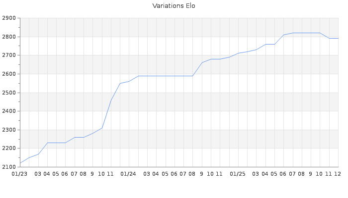 Date d'inscription : 01/11/22. Donateur pour EchecsEmail : Non ( Cliquez ici pour soutenir EchecsEmail. ) Elo non arrondi:2789.8 ( 8 sur 449 joueurs ) Nombre de victoires :45 Nombre de nulles :8 Nombre de défaites :0 Temps de réponse moyen par coup : 0J 9H 28M 16S ( Moyenne sur 59 coups ). Rd ( Un petit rd indique un elo fiable ) : 110 Elo maximum atteint ( en étant classé ) :2820 Elo maximum atteint cette année :2820 Nombre coups joués : 1776 Inscrit dans l' équipe:Fair play Classement coupe : Inactif Points coupe : 0 Classement Coupe Magic Chess : Inactif Points Coupe Magic Chess : 0 Tournoi échelle : Inactif. Tournois gagnés : 13/01/2024 : Cat 6 : Victoire dans le tournoi n°25337 30/11/2023 : Cat 6 : Victoire dans le tournoi n°25304 29/11/2023 : Cat 5 : Victoire dans le tournoi n°25108 12/07/2023 : Cat 5 : Victoire dans le tournoi n°24751 10/03/2023 : Cat 4 : Victoire dans le tournoi n°24556 19/02/2023 : Cat 4 : Victoire dans le tournoi n°24478 09/12/2022 : Cat 2 : Victoire dans le tournoi n°24414 04/12/2022 : Cat 2 : Victoire dans le tournoi n°24384 Nombre de tournois gagnés :8