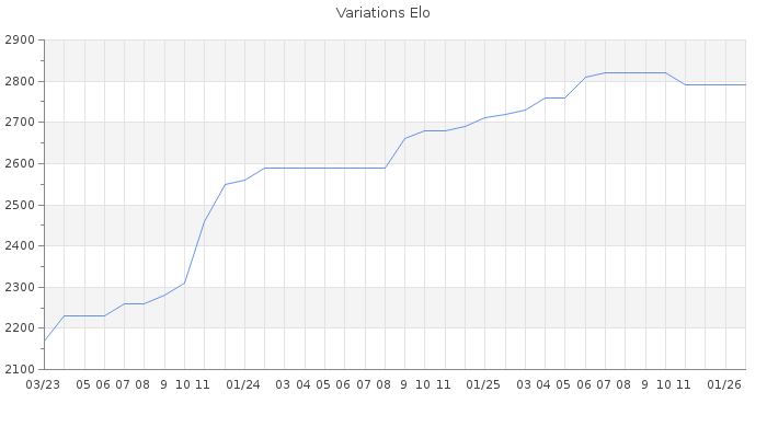 Date d'inscription : 01/11/22. Donateur pour EchecsEmail : Non ( Cliquez ici pour soutenir EchecsEmail. ) Elo non arrondi:2788.1 ( 7 sur 463 joueurs ) Nombre de victoires :47 Nombre de nulles :8 Nombre de défaites :0 Temps de réponse moyen par coup : 0J 6H 18M 14S ( Moyenne sur 53 coups ). Rd ( Un petit rd indique un elo fiable ) : 114 Elo maximum atteint ( en étant classé ) :2820 Elo maximum atteint cette année :0 Nombre coups joués : 1822 Inscrit dans l' équipe:Fair play Classement coupe : Inactif Points coupe : 0 Classement Coupe Magic Chess : Inactif Points Coupe Magic Chess : 0 Tournoi échelle : Inactif. Tournois gagnés : 13/01/2024 : Cat 6 : Victoire dans le tournoi n°25337 30/11/2023 : Cat 6 : Victoire dans le tournoi n°25304 29/11/2023 : Cat 5 : Victoire dans le tournoi n°25108 12/07/2023 : Cat 5 : Victoire dans le tournoi n°24751 10/03/2023 : Cat 4 : Victoire dans le tournoi n°24556 19/02/2023 : Cat 4 : Victoire dans le tournoi n°24478 09/12/2022 : Cat 2 : Victoire dans le tournoi n°24414 04/12/2022 : Cat 2 : Victoire dans le tournoi n°24384 Nombre de tournois gagnés :8