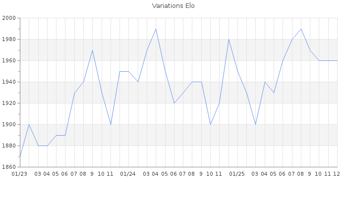 Date d'inscription : 21/07/17. Donateur pour EchecsEmail : Non ( Cliquez ici pour soutenir EchecsEmail. ) Elo non arrondi:1962.8 ( 144 sur 448 joueurs ) Nombre de victoires :238 Nombre de nulles :89 Nombre de défaites :290 Temps de réponse moyen par coup : 0J 17H 34M 37S ( Moyenne sur 242 coups ). Rd ( Un petit rd indique un elo fiable ) : 68 Magic Elo:1700 Magic Rd : 350 Elo maximum atteint ( en étant classé ) :2040 Elo maximum atteint cette année :1990 Nombre coups joués : 24670 Classement coupe : Inactif, date de la dernière qualification : 17/11/24 Points coupe : 5.37 Classement Coupe Magic Chess : Inactif Points Coupe Magic Chess : 0 Tournoi échelle : Inactif. Tournois gagnés : 04/12/2024 : Cat 3 : Victoire CC Nov24 Asc Nombre de tournois gagnés :1