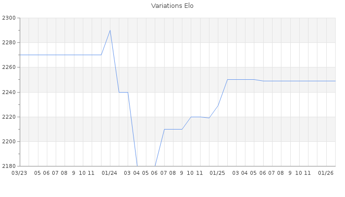 Date d'inscription : 14/12/20. Donateur pour EchecsEmail : Non ( Cliquez ici pour soutenir EchecsEmail. ) Elo non arrondi:2224.9 ( 52 sur 458 joueurs ) Nombre de victoires :85 Nombre de nulles :8 Nombre de défaites :23 Temps de réponse moyen par coup : 0J 5H 48M 29S ( Moyenne sur 2 coups ). Rd ( Un petit rd indique un elo fiable ) : 160 Elo maximum atteint ( en étant classé ) :2400 Elo maximum atteint cette année :0 Nombre coups joués : 3358 Classement coupe : Inactif Points coupe : 0 Classement Coupe Magic Chess : Inactif Points Coupe Magic Chess : 0 Tournoi échelle : Inactif. Tournois gagnés : 26/03/2021 : Cat 5 : Victoire dans le tournoi n°22282 Nombre de tournois gagnés :1