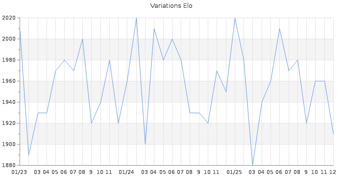 Date d'inscription : Avant le 20/12/05. Donateur pour EchecsEmail : Non ( Cliquez ici pour soutenir EchecsEmail. ) Elo non arrondi:1914 ( 162 sur 449 joueurs ) Nombre de victoires :14082 Nombre de nulles :2305 Nombre de défaites :12054 Temps de réponse moyen par coup : 0J 1H 19M 59S ( Moyenne sur 7018 coups ). Rd ( Un petit rd indique un elo fiable ) : 55 Magic Elo:1403.31 Magic Rd : 226 Elo maximum atteint ( en étant classé ) :2100 Elo maximum atteint cette année :2040 Nombre coups joués : 1009158 Classement coupe : 7 Points coupe : 10474.7 Classement Coupe Magic Chess : Inactif Points Coupe Magic Chess : 0 Tournoi échelle : Champions : 2 Tournois gagnés : 02/12/2019 : Cat 4 : Victoire dans le tournoi n°20454 27/11/2019 : Cat 4 : Victoire dans le tournoi n°20325 13/10/2019 : Cat 4 : Victoire dans le tournoi n°20162 08/10/2019 : Cat 4 : Victoire dans le tournoi n°20183 10/09/2019 : Cat 4 : Victoire dans le tournoi n°20013 18/08/2019 : Cat 4 : Victoire dans le tournoi n°20018 12/07/2019 : Cat 4 : Victoire dans le tournoi n°19832 09/07/2018 : Cat 4 : Victoire dans le tournoi n°17138 21/02/2018 : Cat 4 : Victoire dans le tournoi n°17638 09/01/2018 : Cat 4 : Victoire dans le tournoi n°17471 01/11/2017 : Cat 4 : Victoire dans le tournoi n°17228 02/10/2017 : Cat 4 : Victoire dans le tournoi n°17140 29/09/2017 : Cat 4 : Victoire dans le tournoi n°17122 21/09/2017 : Cat 4 : Victoire dans le tournoi n°16846 13/09/2017 : Cat 4 : Victoire dans le tournoi n°16989 29/05/2017 : Cat 4 : Victoire dans le tournoi n°16460 25/04/2017 : Cat 4 : Victoire dans le tournoi n°16408 12/04/2017 : Cat 4 : Victoire dans le tournoi n°16342 27/03/2017 : Cat 4 : Victoire dans le tournoi n°16307 03/03/2017 : Cat 4 : Victoire dans le tournoi n°16236 10/01/2017 : Cat 4 : Victoire dans le tournoi n°15915 05/11/2016 : Cat 4 : Victoire dans le tournoi n°15593 02/11/2016 : Cat 4 : Victoire dans le tournoi n°15528 19/10/2016 : Cat 4 : Victoire dans le tournoi n°15565 19/10/2016 : Cat 4 : Victoire dans le tournoi n°15281 29/09/2016 : Cat 4 : Victoire dans le tournoi n°15405 09/09/2016 : Cat 4 : Victoire dans le tournoi n°15232 31/08/2016 : Cat 4 : Victoire dans le tournoi n°15140 15/08/2016 : Cat 4 : Victoire dans le tournoi n°15142 09/08/2016 : Cat 4 : Victoire dans le tournoi n°15242 06/08/2016 : Cat 4 : Victoire dans le tournoi n°15135 30/07/2016 : Cat 4 : Victoire dans le tournoi n°15214 30/07/2016 : Cat 4 : Victoire dans le tournoi n°15095 27/07/2016 : Cat 4 : Victoire dans le tournoi n°15116 21/07/2016 : Cat 4 : Victoire dans le tournoi n°15128 14/07/2016 : Cat 4 : Victoire dans le tournoi n°15044 13/07/2016 : Cat 4 : Victoire dans le tournoi n°15092 03/07/2016 : Cat 4 : Victoire dans le tournoi n°14880 24/06/2016 : Cat 4 : Victoire dans le tournoi n°15014 20/06/2016 : Cat 4 : Victoire dans le tournoi n°15016 16/06/2016 : Cat 4 : Victoire dans le tournoi n°14869 14/06/2016 : Cat 4 : Victoire dans le tournoi n°14915 04/06/2016 : Cat 4 : Victoire dans le tournoi n°14945 03/06/2016 : Cat 4 : Victoire dans le tournoi n°14856 24/04/2016 : Cat 4 : Victoire dans le tournoi n°14289 23/04/2016 : Cat 4 : Victoire dans le tournoi n°14567 05/04/2016 : Cat 4 : Victoire dans le tournoi n°14503 04/04/2016 : Cat 4 : Victoire dans le tournoi n°18791 02/02/2016 : Cat 4 : Victoire dans le tournoi n°18978 11/01/2016 : Cat 4 : Victoire dans le tournoi n°18875 09/12/2015 : Cat 4 : Victoire dans le tournoi n°18816 07/10/2015 : Cat 4 : Victoire dans le tournoi n°17714 19/07/2015 : Cat 4 : Victoire dans le tournoi n°17683 15/07/2015 : Cat 4 : Victoire dans le tournoi n°17479 13/07/2015 : Cat 4 : Victoire dans le tournoi n°17933 07/07/2015 : Cat 4 : Victoire dans le tournoi n°17726 07/07/2015 : Cat 4 : Victoire dans le tournoi n°17503 26/05/2015 : Cat 3 : Victoire dans le tournoi n°17678 22/05/2015 : Cat 4 : Victoire dans le tournoi n°17474 21/11/2014 : Cat 4 : Victoire dans le tournoi n°16230 20/10/2014 : Cat 4 : Victoire dans le tournoi n°15684 29/09/2014 : Cat 4 : Victoire dans le tournoi n°15568 28/09/2014 : Cat 4 : Victoire dans le tournoi n°16079 20/09/2014 : Cat 4 : Victoire dans le tournoi n°15909 15/09/2014 : Cat 4 : Victoire dans le tournoi n°15961 12/09/2014 : Cat 4 : Victoire dans le tournoi n°15638 02/09/2014 : Cat 4 : Victoire dans le tournoi n°15983 20/08/2014 : Cat 4 : Victoire dans le tournoi n°15691 20/08/2014 : Cat 4 : Victoire dans le tournoi n°15540 12/07/2014 : Cat 4 : Victoire dans le tournoi n°15566 09/07/2014 : Cat 4 : Victoire dans le tournoi n°15402 30/06/2014 : Cat 4 : Victoire dans le tournoi n°15439 18/06/2014 : Cat 4 : Victoire dans le tournoi n°15368 08/06/2014 : Cat 4 : Victoire dans le tournoi n°15446 22/05/2014 : Cat 4 : Victoire dans le tournoi n°15221 26/04/2014 : Cat 4 : Victoire dans le tournoi n°14842 10/04/2014 : Cat 4 : Victoire dans le tournoi n°14935 12/03/2014 : Cat 4 : Victoire dans le tournoi n°14516 12/03/2014 : Cat 4 : Victoire dans le tournoi n°13980 03/03/2014 : Cat 4 : Victoire dans le tournoi n°14507 09/02/2014 : Cat 4 : Victoire dans le tournoi n°14335 05/02/2014 : Cat 4 : Victoire dans le tournoi n°14220 28/01/2014 : Cat 4 : Victoire dans le tournoi n°14191 21/01/2014 : Cat 4 : Victoire dans le tournoi n°14185 08/12/2013 : Cat 4 : Victoire dans le tournoi n°14044 03/12/2013 : Cat 4 : Victoire dans le tournoi n°13706 28/11/2013 : Cat 4 : Victoire dans le tournoi n°13859 14/11/2013 : Cat 4 : Victoire dans le tournoi n°13612 31/10/2013 : Cat 4 : Victoire dans le tournoi n°13196 29/10/2013 : Cat 4 : Victoire dans le tournoi n°13325 11/10/2013 : Cat 4 : Victoire dans le tournoi n°13288 17/09/2013 : Cat 4 : Victoire dans le tournoi n°13308 15/09/2013 : Cat 4 : Victoire dans le tournoi n°13261 14/09/2013 : Cat 4 : Victoire dans le tournoi n°13266 09/09/2013 : Cat 4 : Victoire dans le tournoi n°12880 15/08/2013 : Cat 4 : Victoire dans le tournoi n°12390 08/08/2013 : Cat 4 : Victoire dans le tournoi 