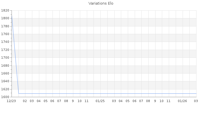 Date d'inscription : 22/12/23. Donateur pour EchecsEmail : Non ( Cliquez ici pour soutenir EchecsEmail. ) Elo non arrondi:1568.8 ( 378 sur 445 joueurs ) Nombre de victoires :0 Nombre de nulles :0 Nombre de défaites :2 Temps de réponse moyen par coup : 1J 0H 7M 29S ( Moyenne sur 0 coups ). Rd ( Un petit rd indique un elo fiable ) : 223 Elo maximum atteint ( en étant classé ) :0 Elo maximum atteint cette année :0 Nombre coups joués : 10 Classement coupe : Inactif Points coupe : 0 Classement Coupe Magic Chess : Inactif Points Coupe Magic Chess : 0 Tournoi échelle : Nombre de tournois gagnés :0