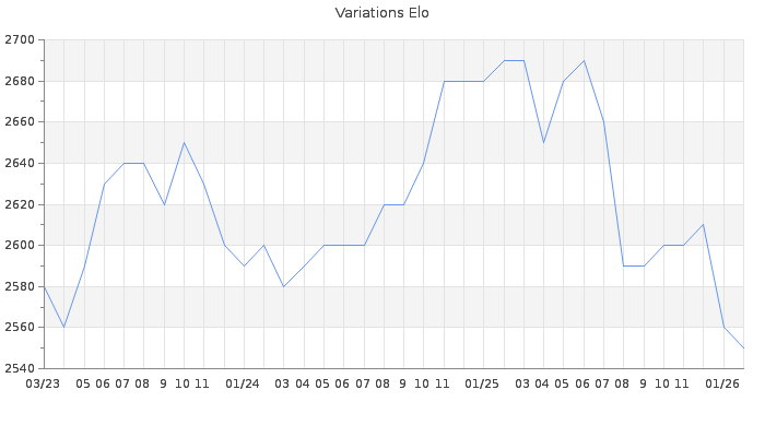 Date d'inscription : 07/01/14. Donateur pour EchecsEmail : Non ( Cliquez ici pour soutenir EchecsEmail. ) Elo non arrondi:2551.7 ( 21 sur 459 joueurs ) Nombre de victoires :1686 Nombre de nulles :488 Nombre de défaites :782 Temps de réponse moyen par coup : 0J 9H 57M 10S ( Moyenne sur 465 coups ). Rd ( Un petit rd indique un elo fiable ) : 82 Magic Elo:1665.71 Magic Rd : 80 Elo maximum atteint ( en étant classé ) :2710 Elo maximum atteint cette année :2620 Nombre coups joués : 121445 Inscrit dans l' équipe:Pirates du Mat Classement coupe : Inactif Points coupe : 1.96 Classement Coupe Magic Chess : Inactif Points Coupe Magic Chess : 0 Tournoi échelle : Inactif. Tournois gagnés : 19/05/2019 : Cat 6 : Victoire dans le tournoi n°19534 31/01/2018 : Cat 6 : Victoire dans le tournoi n°17403 29/03/2017 : Cat 6 : Victoire dans le tournoi n°16243 29/10/2016 : Cat 5 : Victoire dans le tournoi n°15340 24/10/2016 : Cat 6 : Victoire dans le tournoi n°15415 15/10/2016 : Cat 5 : Victoire dans le tournoi n°15379 16/09/2016 : Cat 5 : Victoire dans le tournoi n°15096 02/09/2016 : Cat 4 : Victoire dans le tournoi n°14808 18/08/2016 : Cat 5 : Victoire dans le tournoi n°15134 14/08/2016 : Cat 5 : Victoire dans le tournoi n°15118 11/08/2016 : Cat 5 : Victoire dans le tournoi n°15210 14/06/2016 : Cat 5 : Victoire dans le tournoi n°14965 31/05/2016 : Cat 4 : Victoire dans le tournoi n°14050 24/05/2016 : Cat 5 : Victoire dans le tournoi n°14873 10/05/2016 : Cat 4 : Victoire dans le tournoi n°14497 03/05/2016 : Cat 5 : Victoire dans le tournoi n°14738 02/05/2016 : Cat 4 : Victoire dans le tournoi n°14818 28/04/2016 : Cat 4 : Victoire dans le tournoi n°14747 23/04/2016 : Cat 4 : Victoire dans le tournoi n°14731 22/04/2016 : Cat 4 : Victoire dans le tournoi n°14758 15/04/2016 : Cat 4 : Victoire dans le tournoi n°14714 12/04/2016 : Cat 4 : Victoire dans le tournoi n°14665 07/04/2016 : Cat 4 : Victoire dans le tournoi n°14572 01/04/2016 : Cat 4 : Victoire dans le tournoi n°14580 25/03/2016 : Cat 4 : Victoire dans le tournoi n°14502 16/03/2016 : Cat 4 : Victoire dans le tournoi n°14486 03/03/2016 : Cat 4 : Victoire dans le tournoi n°14151 28/02/2016 : Cat 4 : Victoire dans le tournoi n°14293 28/02/2016 : Cat 4 : Victoire dans le tournoi n°14074 25/01/2016 : Cat 4 : Victoire dans le tournoi n°14009 20/01/2016 : Cat 4 : Victoire dans le tournoi n°14199 10/01/2016 : Cat 4 : Victoire dans le tournoi n°14027 07/01/2016 : Cat 4 : Victoire dans le tournoi n°14114 28/12/2015 : Cat 4 : Victoire dans le tournoi n°14019 22/12/2015 : Cat 4 : Victoire dans le tournoi n°18688 21/12/2015 : Cat 4 : Victoire dans le tournoi n°18679 21/12/2015 : Cat 4 : Victoire dans le tournoi n°18602 17/12/2015 : Cat 4 : Victoire dans le tournoi n°18542 16/12/2015 : Cat 4 : Victoire dans le tournoi n°18859 08/12/2015 : Cat 4 : Victoire dans le tournoi n°18828 26/10/2015 : Cat 4 : Victoire dans le tournoi n°18587 07/10/2015 : Cat 4 : Victoire dans le tournoi n°18321 04/10/2015 : Cat 4 : Victoire dans le tournoi n°18190 29/09/2015 : Cat 5 : Victoire dans le tournoi n°18403 15/09/2015 : Cat 4 : Victoire dans le tournoi n°18395 12/06/2015 : Cat 4 : Victoire dans le tournoi n°17721 02/06/2015 : Cat 4 : Victoire dans le tournoi n°17622 20/05/2015 : Cat 4 : Victoire dans le tournoi n°17411 09/05/2015 : Cat 4 : Victoire dans le tournoi n°17649 20/04/2015 : Cat 4 : Victoire dans le tournoi n°17520 07/04/2015 : Cat 4 : Victoire dans le tournoi n°17244 29/01/2015 : Cat 4 : Victoire dans le tournoi n°16707 16/01/2015 : Cat 4 : Victoire dans le tournoi n°16672 08/01/2015 : Cat 4 : Victoire dans le tournoi n°16626 10/12/2014 : Cat 4 : Victoire dans le tournoi n°16395 24/11/2014 : Cat 4 : Victoire dans le tournoi n°16420 20/11/2014 : Cat 4 : Victoire dans le tournoi n°16321 19/11/2014 : Cat 4 : Victoire dans le tournoi n°16325 11/11/2014 : Cat 4 : Victoire dans le tournoi n°16093 28/10/2014 : Cat 4 : Victoire dans le tournoi n°16043 04/10/2014 : Cat 4 : Victoire dans le tournoi n°16031 01/10/2014 : Cat 4 : Victoire dans le tournoi n°16097 19/09/2014 : Cat 4 : Victoire dans le tournoi n°16057 11/09/2014 : Cat 4 : Victoire dans le tournoi n°15937 11/09/2014 : Cat 4 : Victoire dans le tournoi n°15725 02/09/2014 : Cat 4 : Victoire dans le tournoi n°15737 28/08/2014 : Cat 5 : Victoire dans le tournoi n°15604 09/07/2014 : Cat 4 : Victoire dans le tournoi n°15464 06/06/2014 : Cat 4 : Victoire dans le tournoi n°15302 03/04/2014 : Cat 4 : Victoire dans le tournoi n°14657 06/02/2014 : Cat 4 : Victoire dans le tournoi n°14540 Nombre de tournois gagnés :71