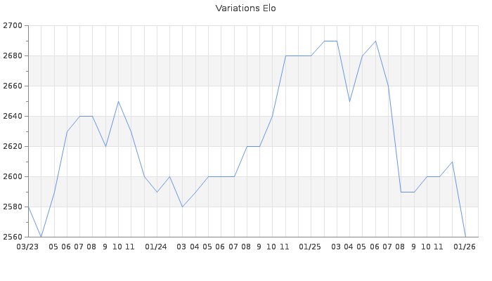 Date d'inscription : 07/01/14. Donateur pour EchecsEmail : Non ( Cliquez ici pour soutenir EchecsEmail. ) Elo non arrondi:2558.8 ( 19 sur 458 joueurs ) Nombre de victoires :1687 Nombre de nulles :488 Nombre de défaites :782 Temps de réponse moyen par coup : 0J 9H 55M 25S ( Moyenne sur 422 coups ). Rd ( Un petit rd indique un elo fiable ) : 81 Magic Elo:1665.71 Magic Rd : 80 Elo maximum atteint ( en étant classé ) :2710 Elo maximum atteint cette année :2620 Nombre coups joués : 121449 Inscrit dans l' équipe:Pirates du Mat Classement coupe : Inactif Points coupe : 1.96 Classement Coupe Magic Chess : Inactif Points Coupe Magic Chess : 0 Tournoi échelle : Inactif. Tournois gagnés : 19/05/2019 : Cat 6 : Victoire dans le tournoi n°19534 31/01/2018 : Cat 6 : Victoire dans le tournoi n°17403 29/03/2017 : Cat 6 : Victoire dans le tournoi n°16243 29/10/2016 : Cat 5 : Victoire dans le tournoi n°15340 24/10/2016 : Cat 6 : Victoire dans le tournoi n°15415 15/10/2016 : Cat 5 : Victoire dans le tournoi n°15379 16/09/2016 : Cat 5 : Victoire dans le tournoi n°15096 02/09/2016 : Cat 4 : Victoire dans le tournoi n°14808 18/08/2016 : Cat 5 : Victoire dans le tournoi n°15134 14/08/2016 : Cat 5 : Victoire dans le tournoi n°15118 11/08/2016 : Cat 5 : Victoire dans le tournoi n°15210 14/06/2016 : Cat 5 : Victoire dans le tournoi n°14965 31/05/2016 : Cat 4 : Victoire dans le tournoi n°14050 24/05/2016 : Cat 5 : Victoire dans le tournoi n°14873 10/05/2016 : Cat 4 : Victoire dans le tournoi n°14497 03/05/2016 : Cat 5 : Victoire dans le tournoi n°14738 02/05/2016 : Cat 4 : Victoire dans le tournoi n°14818 28/04/2016 : Cat 4 : Victoire dans le tournoi n°14747 23/04/2016 : Cat 4 : Victoire dans le tournoi n°14731 22/04/2016 : Cat 4 : Victoire dans le tournoi n°14758 15/04/2016 : Cat 4 : Victoire dans le tournoi n°14714 12/04/2016 : Cat 4 : Victoire dans le tournoi n°14665 07/04/2016 : Cat 4 : Victoire dans le tournoi n°14572 01/04/2016 : Cat 4 : Victoire dans le tournoi n°14580 25/03/2016 : Cat 4 : Victoire dans le tournoi n°14502 16/03/2016 : Cat 4 : Victoire dans le tournoi n°14486 03/03/2016 : Cat 4 : Victoire dans le tournoi n°14151 28/02/2016 : Cat 4 : Victoire dans le tournoi n°14293 28/02/2016 : Cat 4 : Victoire dans le tournoi n°14074 25/01/2016 : Cat 4 : Victoire dans le tournoi n°14009 20/01/2016 : Cat 4 : Victoire dans le tournoi n°14199 10/01/2016 : Cat 4 : Victoire dans le tournoi n°14027 07/01/2016 : Cat 4 : Victoire dans le tournoi n°14114 28/12/2015 : Cat 4 : Victoire dans le tournoi n°14019 22/12/2015 : Cat 4 : Victoire dans le tournoi n°18688 21/12/2015 : Cat 4 : Victoire dans le tournoi n°18679 21/12/2015 : Cat 4 : Victoire dans le tournoi n°18602 17/12/2015 : Cat 4 : Victoire dans le tournoi n°18542 16/12/2015 : Cat 4 : Victoire dans le tournoi n°18859 08/12/2015 : Cat 4 : Victoire dans le tournoi n°18828 26/10/2015 : Cat 4 : Victoire dans le tournoi n°18587 07/10/2015 : Cat 4 : Victoire dans le tournoi n°18321 04/10/2015 : Cat 4 : Victoire dans le tournoi n°18190 29/09/2015 : Cat 5 : Victoire dans le tournoi n°18403 15/09/2015 : Cat 4 : Victoire dans le tournoi n°18395 12/06/2015 : Cat 4 : Victoire dans le tournoi n°17721 02/06/2015 : Cat 4 : Victoire dans le tournoi n°17622 20/05/2015 : Cat 4 : Victoire dans le tournoi n°17411 09/05/2015 : Cat 4 : Victoire dans le tournoi n°17649 20/04/2015 : Cat 4 : Victoire dans le tournoi n°17520 07/04/2015 : Cat 4 : Victoire dans le tournoi n°17244 29/01/2015 : Cat 4 : Victoire dans le tournoi n°16707 16/01/2015 : Cat 4 : Victoire dans le tournoi n°16672 08/01/2015 : Cat 4 : Victoire dans le tournoi n°16626 10/12/2014 : Cat 4 : Victoire dans le tournoi n°16395 24/11/2014 : Cat 4 : Victoire dans le tournoi n°16420 20/11/2014 : Cat 4 : Victoire dans le tournoi n°16321 19/11/2014 : Cat 4 : Victoire dans le tournoi n°16325 11/11/2014 : Cat 4 : Victoire dans le tournoi n°16093 28/10/2014 : Cat 4 : Victoire dans le tournoi n°16043 04/10/2014 : Cat 4 : Victoire dans le tournoi n°16031 01/10/2014 : Cat 4 : Victoire dans le tournoi n°16097 19/09/2014 : Cat 4 : Victoire dans le tournoi n°16057 11/09/2014 : Cat 4 : Victoire dans le tournoi n°15937 11/09/2014 : Cat 4 : Victoire dans le tournoi n°15725 02/09/2014 : Cat 4 : Victoire dans le tournoi n°15737 28/08/2014 : Cat 5 : Victoire dans le tournoi n°15604 09/07/2014 : Cat 4 : Victoire dans le tournoi n°15464 06/06/2014 : Cat 4 : Victoire dans le tournoi n°15302 03/04/2014 : Cat 4 : Victoire dans le tournoi n°14657 06/02/2014 : Cat 4 : Victoire dans le tournoi n°14540 Nombre de tournois gagnés :71