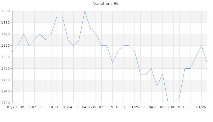 Date d'inscription : 02/05/06. Donateur pour EchecsEmail : Non ( Cliquez ici pour soutenir EchecsEmail. ) Elo non arrondi:1792.5 ( 223 sur 463 joueurs ) Nombre de victoires :1350 Nombre de nulles :468 Nombre de défaites :1474 Temps de réponse moyen par coup : 0J 16H 13M 49S ( Moyenne sur 385 coups ). Rd ( Un petit rd indique un elo fiable ) : 83 Magic Elo:1600 Magic Rd : 350 Elo maximum atteint ( en étant classé ) :1970 Elo maximum atteint cette année :1850 Nombre coups joués : 128015 Inscrit dans l' équipe:Les Gens du Sud Classement coupe : 110 Points coupe : 50.63 Classement Coupe Magic Chess : Inactif Points Coupe Magic Chess : 0 Tournoi échelle : Inactif. Tournois gagnés : 16/01/2021 : Cat 3 : Victoire CC Nov20 Asc 11/09/2012 : Cat 3 : Victoire dans le tournoi n°10639 06/10/2011 : Cat 3 : Victoire dans le tournoi n°9000 Nombre de tournois gagnés :3