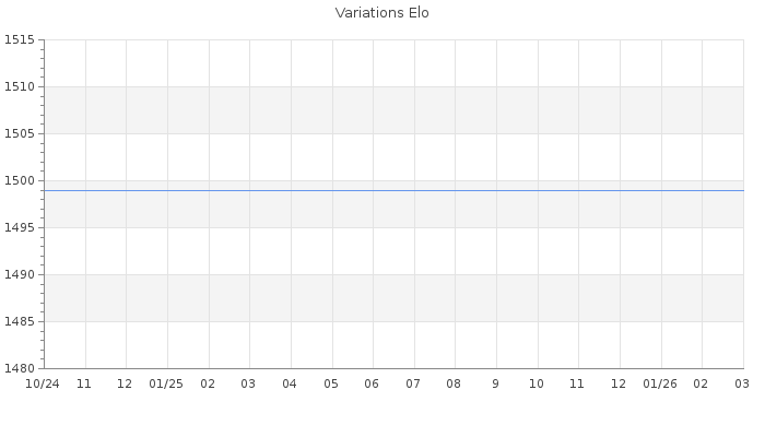 Date d'inscription : 09/10/24. Donateur pour EchecsEmail : Non ( Cliquez ici pour soutenir EchecsEmail. ) Elo non arrondi:1467 ( 407 sur 445 joueurs ) Nombre de victoires :0 Nombre de nulles :0 Nombre de défaites :0 Rd ( Un petit rd indique un elo fiable ) : 350 Elo maximum atteint ( en étant classé ) :0 Elo maximum atteint cette année :0 Nombre coups joués : 1 Classement coupe : Inactif Points coupe : 0 Classement Coupe Magic Chess : Inactif Points Coupe Magic Chess : 0 Tournoi échelle : Nombre de tournois gagnés :0