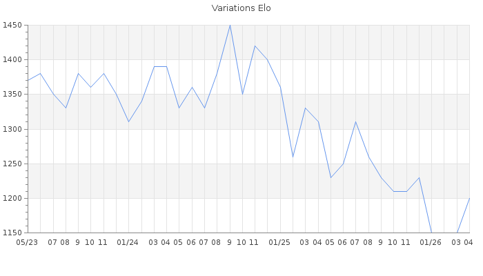 Date d'inscription : 09/02/09. Donateur pour EchecsEmail : Non ( Cliquez ici pour soutenir EchecsEmail. ) Elo non arrondi:1194.8 ( 435 sur 452 joueurs ) Nombre de victoires :4028 Nombre de nulles :608 Nombre de défaites :5735 Temps de réponse moyen par coup : 0J 18H 21M 24S ( Moyenne sur 550 coups ). Rd ( Un petit rd indique un elo fiable ) : 75 Magic Elo:1600 Magic Rd : 350 Elo maximum atteint ( en étant classé ) :1850 Elo maximum atteint cette année :1230 Nombre coups joués : 378089 Classement coupe : Inactif, date de la dernière qualification : 25/05/22 Points coupe : 0.4 Classement Coupe Magic Chess : Inactif Points Coupe Magic Chess : 0 Tournoi échelle : Tournois gagnés : 02/07/2023 : Cat 1 : Victoire dans le tournoi n°24964 12/06/2023 : Cat 1 : Victoire dans le tournoi n°24948 03/08/2022 : Cat 1 : Victoire dans le tournoi n°24115 21/01/2022 : Cat 1 : Victoire dans le tournoi n°23478 20/01/2022 : Cat 1 : Victoire dans le tournoi n°23501 14/01/2022 : Cat 1 : Victoire dans le tournoi n°23451 28/10/2021 : Cat 1 : Victoire dans le tournoi n°23214 28/12/2019 : Cat 1 : Victoire dans le tournoi n°20272 06/11/2019 : Cat 1 : Victoire dans le tournoi n°20253 15/09/2019 : Cat 1 : Victoire dans le tournoi n°20073 28/02/2019 : Cat 1 : Victoire dans le tournoi n°19257 03/02/2019 : Cat 1 : Victoire dans le tournoi n°19053 23/01/2019 : Cat 1 : Victoire dans le tournoi n°18966 18/10/2018 : Cat 2 : Premier au tournoi multi Automne 2018 n°4 18/10/2018 : Cat 1 : Victoire dans le tournoi n°18644 15/10/2018 : Cat 1 : Victoire dans le tournoi n°18533 24/08/2017 : Cat 2 : Premier au tournoi multi Eté 2017 n°3 26/04/2017 : Cat 2 : Premier au tournoi multi Printemps 2017 n°4 20/10/2016 : Cat 0 : Premier au tournoi multi Automne 2016 n°3 21/12/2015 : Cat 0 : Premier au tournoi multi Halloween 2015 n°4 06/11/2015 : Cat 0 : Premier au tournoi multi Automne 2015 n°2 15/08/2015 : Cat 0 : Premier au tournoi multi Eté 2015 n°14 24/05/2015 : Cat 0 : Premier au tournoi multi Printemps 2015 n°4 05/12/2014 : Cat 0 : Premier au tournoi multi Halloween 2014 n°6 06/12/2013 : Cat 0 : Premier au tournoi multi Automne 2013 !!! n°1 19/10/2013 : Cat 0 : Premier au tournoi multi Automne 2013 !!! n°3 17/10/2013 : Cat 0 : Premier au tournoi multi Ete 2013 !!! n°1 26/08/2013 : Cat 1 : Victoire dans le tournoi n°12301 07/08/2013 : Cat 0 : Premier au tournoi multi Ete 2013 !!! n°5 19/02/2013 : Cat 1 : Victoire dans le tournoi n°11681 16/01/2013 : Cat 0 : Premier au tournoi multi Noël 2012 !!! n°3 30/12/2012 : Cat 1 : Victoire dans le tournoi n°11301 25/12/2012 : Cat 2 : Victoire dans le tournoi n°10911 10/12/2012 : Cat 0 : Premier au tournoi multi Halloween 2012 !!! n°5 17/07/2012 : Cat 1 : Victoire dans le tournoi n°10566 26/04/2012 : Cat 2 : Victoire dans le tournoi n°9917 02/04/2012 : Cat 2 : Victoire dans le tournoi n°10035 13/03/2012 : Cat 1 : Victoire dans le tournoi n°9851 20/02/2012 : Cat 1 : Victoire dans le tournoi n°9843 17/02/2012 : Cat 1 : Victoire dans le tournoi n°9848 26/01/2012 : Cat 1 : Victoire dans le tournoi n°9514 26/01/2012 : Cat 1 : Victoire dans le tournoi n°9486 13/01/2012 : Cat 1 : Victoire dans le tournoi n°9632 08/01/2012 : Cat 0 : Premier au tournoi multi Automne 2011 n°1 01/01/2012 : Cat 1 : Victoire dans le tournoi n°9499 29/11/2011 : Cat 0 : Premier au tournoi multi Automne 2011 n°3 28/11/2011 : Cat 2 : Victoire dans le tournoi n°9488 24/11/2011 : Cat 2 : Victoire dans le tournoi n°9253 22/11/2011 : Cat 1 : Victoire dans le tournoi n°9206 15/11/2011 : Cat 1 : Victoire dans le tournoi n°9260 27/10/2011 : Cat 2 : Victoire dans le tournoi n°8878 05/09/2011 : Cat 1 : Victoire dans le tournoi n°8953 01/09/2011 : Cat 0 : Premier au tournoi multi Ete 2011 n°1 21/08/2011 : Cat 2 : Victoire dans le tournoi n°8840 15/07/2011 : Cat 2 : Victoire dans le tournoi n°8898 09/07/2011 : Cat 2 : Victoire dans le tournoi n°8823 07/07/2011 : Cat 0 : Premier au tournoi multi Ete 2011 n°5 18/06/2011 : Cat 3 : Victoire dans le tournoi n°8835 13/05/2011 : Cat 2 : Victoire dans le tournoi n°8573 25/04/2011 : Cat 2 : Victoire dans le tournoi n°8526 07/04/2011 : Cat 2 : Victoire dans le tournoi n°8535 09/02/2011 : Cat 2 : Victoire dans le tournoi n°8211 29/01/2011 : Cat 2 : Victoire dans le tournoi n°8110 25/01/2011 : Cat 0 : Premier au tournoi multi Noel 2010 n°5 24/01/2011 : Cat 2 : Victoire dans le tournoi n°8117 19/01/2011 : Cat 2 : Victoire dans le tournoi n°8061 25/12/2010 : Cat 1 : Victoire dans le tournoi n°8085 25/12/2010 : Cat 1 : Victoire dans le tournoi n°8068 02/11/2010 : Cat 2 : Victoire dans le tournoi n°7904 20/10/2010 : Cat 1 : Victoire dans le tournoi n°7809 15/10/2010 : Cat 2 : Victoire dans le tournoi n°7821 06/10/2010 : Cat 2 : Victoire dans le tournoi n°7589 07/09/2010 : Cat 2 : Victoire dans le tournoi n°7708 04/09/2010 : Cat 2 : Victoire dans le tournoi n°7681 27/08/2010 : Cat 2 : Victoire dans le tournoi n°7600 22/06/2010 : Cat 2 : Victoire dans le tournoi n°7431 25/05/2010 : Cat 2 : Victoire dans le tournoi n°7195 31/01/2010 : Cat 2 : Victoire dans le tournoi n°6940 18/01/2010 : Cat 1 : Victoire dans le tournoi n°6872 30/12/2009 : Cat 1 : Victoire dans le tournoi n°6741 27/12/2009 : Cat 1 : Victoire dans le tournoi n°6731 09/12/2009 : Cat 1 : Victoire dans le tournoi n°6644 23/11/2009 : Cat 1 : Victoire dans le tournoi n°6655 08/11/2009 : Cat 2 : Victoire dans le tournoi n°6518 25/10/2009 : Cat 2 : Victoire dans le tournoi n°6484 14/10/2009 : Cat 2 : Victoire dans le tournoi n°6466 12/10/2009 : Cat 2 : Victoire dans le tournoi n°6443 09/10/2009 : Cat 2 : Victoire dans le tournoi n°6413 27/09/2009 : Cat 2 : Victoire dans le tournoi n°6393 Nombre de tournois gagnés :89