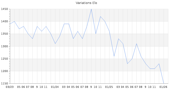 Date d'inscription : 09/02/09. Donateur pour EchecsEmail : Non ( Cliquez ici pour soutenir EchecsEmail. ) Elo non arrondi:1148.4 ( 449 sur 463 joueurs ) Nombre de victoires :4024 Nombre de nulles :608 Nombre de défaites :5730 Temps de réponse moyen par coup : 0J 18H 6M 6S ( Moyenne sur 637 coups ). Rd ( Un petit rd indique un elo fiable ) : 70 Magic Elo:1600 Magic Rd : 350 Elo maximum atteint ( en étant classé ) :1850 Elo maximum atteint cette année :1230 Nombre coups joués : 377566 Classement coupe : Inactif, date de la dernière qualification : 25/05/22 Points coupe : 0.44 Classement Coupe Magic Chess : Inactif Points Coupe Magic Chess : 0 Tournoi échelle : Tournois gagnés : 02/07/2023 : Cat 1 : Victoire dans le tournoi n°24964 12/06/2023 : Cat 1 : Victoire dans le tournoi n°24948 03/08/2022 : Cat 1 : Victoire dans le tournoi n°24115 21/01/2022 : Cat 1 : Victoire dans le tournoi n°23478 20/01/2022 : Cat 1 : Victoire dans le tournoi n°23501 14/01/2022 : Cat 1 : Victoire dans le tournoi n°23451 28/10/2021 : Cat 1 : Victoire dans le tournoi n°23214 28/12/2019 : Cat 1 : Victoire dans le tournoi n°20272 06/11/2019 : Cat 1 : Victoire dans le tournoi n°20253 15/09/2019 : Cat 1 : Victoire dans le tournoi n°20073 28/02/2019 : Cat 1 : Victoire dans le tournoi n°19257 03/02/2019 : Cat 1 : Victoire dans le tournoi n°19053 23/01/2019 : Cat 1 : Victoire dans le tournoi n°18966 18/10/2018 : Cat 2 : Premier au tournoi multi Automne 2018 n°4 18/10/2018 : Cat 1 : Victoire dans le tournoi n°18644 15/10/2018 : Cat 1 : Victoire dans le tournoi n°18533 24/08/2017 : Cat 2 : Premier au tournoi multi Eté 2017 n°3 26/04/2017 : Cat 2 : Premier au tournoi multi Printemps 2017 n°4 20/10/2016 : Cat 0 : Premier au tournoi multi Automne 2016 n°3 21/12/2015 : Cat 0 : Premier au tournoi multi Halloween 2015 n°4 06/11/2015 : Cat 0 : Premier au tournoi multi Automne 2015 n°2 15/08/2015 : Cat 0 : Premier au tournoi multi Eté 2015 n°14 24/05/2015 : Cat 0 : Premier au tournoi multi Printemps 2015 n°4 05/12/2014 : Cat 0 : Premier au tournoi multi Halloween 2014 n°6 06/12/2013 : Cat 0 : Premier au tournoi multi Automne 2013 !!! n°1 19/10/2013 : Cat 0 : Premier au tournoi multi Automne 2013 !!! n°3 17/10/2013 : Cat 0 : Premier au tournoi multi Ete 2013 !!! n°1 26/08/2013 : Cat 1 : Victoire dans le tournoi n°12301 07/08/2013 : Cat 0 : Premier au tournoi multi Ete 2013 !!! n°5 19/02/2013 : Cat 1 : Victoire dans le tournoi n°11681 16/01/2013 : Cat 0 : Premier au tournoi multi Noël 2012 !!! n°3 30/12/2012 : Cat 1 : Victoire dans le tournoi n°11301 25/12/2012 : Cat 2 : Victoire dans le tournoi n°10911 10/12/2012 : Cat 0 : Premier au tournoi multi Halloween 2012 !!! n°5 17/07/2012 : Cat 1 : Victoire dans le tournoi n°10566 26/04/2012 : Cat 2 : Victoire dans le tournoi n°9917 02/04/2012 : Cat 2 : Victoire dans le tournoi n°10035 13/03/2012 : Cat 1 : Victoire dans le tournoi n°9851 20/02/2012 : Cat 1 : Victoire dans le tournoi n°9843 17/02/2012 : Cat 1 : Victoire dans le tournoi n°9848 26/01/2012 : Cat 1 : Victoire dans le tournoi n°9514 26/01/2012 : Cat 1 : Victoire dans le tournoi n°9486 13/01/2012 : Cat 1 : Victoire dans le tournoi n°9632 08/01/2012 : Cat 0 : Premier au tournoi multi Automne 2011 n°1 01/01/2012 : Cat 1 : Victoire dans le tournoi n°9499 29/11/2011 : Cat 0 : Premier au tournoi multi Automne 2011 n°3 28/11/2011 : Cat 2 : Victoire dans le tournoi n°9488 24/11/2011 : Cat 2 : Victoire dans le tournoi n°9253 22/11/2011 : Cat 1 : Victoire dans le tournoi n°9206 15/11/2011 : Cat 1 : Victoire dans le tournoi n°9260 27/10/2011 : Cat 2 : Victoire dans le tournoi n°8878 05/09/2011 : Cat 1 : Victoire dans le tournoi n°8953 01/09/2011 : Cat 0 : Premier au tournoi multi Ete 2011 n°1 21/08/2011 : Cat 2 : Victoire dans le tournoi n°8840 15/07/2011 : Cat 2 : Victoire dans le tournoi n°8898 09/07/2011 : Cat 2 : Victoire dans le tournoi n°8823 07/07/2011 : Cat 0 : Premier au tournoi multi Ete 2011 n°5 18/06/2011 : Cat 3 : Victoire dans le tournoi n°8835 13/05/2011 : Cat 2 : Victoire dans le tournoi n°8573 25/04/2011 : Cat 2 : Victoire dans le tournoi n°8526 07/04/2011 : Cat 2 : Victoire dans le tournoi n°8535 09/02/2011 : Cat 2 : Victoire dans le tournoi n°8211 29/01/2011 : Cat 2 : Victoire dans le tournoi n°8110 25/01/2011 : Cat 0 : Premier au tournoi multi Noel 2010 n°5 24/01/2011 : Cat 2 : Victoire dans le tournoi n°8117 19/01/2011 : Cat 2 : Victoire dans le tournoi n°8061 25/12/2010 : Cat 1 : Victoire dans le tournoi n°8085 25/12/2010 : Cat 1 : Victoire dans le tournoi n°8068 02/11/2010 : Cat 2 : Victoire dans le tournoi n°7904 20/10/2010 : Cat 1 : Victoire dans le tournoi n°7809 15/10/2010 : Cat 2 : Victoire dans le tournoi n°7821 06/10/2010 : Cat 2 : Victoire dans le tournoi n°7589 07/09/2010 : Cat 2 : Victoire dans le tournoi n°7708 04/09/2010 : Cat 2 : Victoire dans le tournoi n°7681 27/08/2010 : Cat 2 : Victoire dans le tournoi n°7600 22/06/2010 : Cat 2 : Victoire dans le tournoi n°7431 25/05/2010 : Cat 2 : Victoire dans le tournoi n°7195 31/01/2010 : Cat 2 : Victoire dans le tournoi n°6940 18/01/2010 : Cat 1 : Victoire dans le tournoi n°6872 30/12/2009 : Cat 1 : Victoire dans le tournoi n°6741 27/12/2009 : Cat 1 : Victoire dans le tournoi n°6731 09/12/2009 : Cat 1 : Victoire dans le tournoi n°6644 23/11/2009 : Cat 1 : Victoire dans le tournoi n°6655 08/11/2009 : Cat 2 : Victoire dans le tournoi n°6518 25/10/2009 : Cat 2 : Victoire dans le tournoi n°6484 14/10/2009 : Cat 2 : Victoire dans le tournoi n°6466 12/10/2009 : Cat 2 : Victoire dans le tournoi n°6443 09/10/2009 : Cat 2 : Victoire dans le tournoi n°6413 27/09/2009 : Cat 2 : Victoire dans le tournoi n°6393 Nombre de tournois gagnés :89