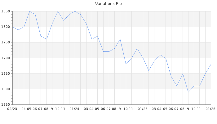 Date d'inscription : 08/11/15. Donateur pour EchecsEmail : Non ( Cliquez ici pour soutenir EchecsEmail. ) Elo non arrondi:1678.4 ( 296 sur 462 joueurs ) Nombre de victoires :351 Nombre de nulles :66 Nombre de défaites :498 Temps de réponse moyen par coup : 0J 16H 6M 21S ( Moyenne sur 768 coups ). Rd ( Un petit rd indique un elo fiable ) : 62 Magic Elo:1700 Magic Rd : 350 Elo maximum atteint ( en étant classé ) :1860 Elo maximum atteint cette année :1690 Nombre coups joués : 28771 Inscrit dans l' équipe:au plaisir du jeux Classement coupe : Inactif, date de la dernière qualification : 07/10/24 Points coupe : 15.59 Classement Coupe Magic Chess : Inactif Points Coupe Magic Chess : 0 Tournoi échelle : Inactif. Tournois gagnés : 21/08/2024 : Cat 4 : Victoire dans le tournoi n°25638 01/03/2024 : Cat 3 : Victoire dans le tournoi n°25457 15/12/2023 : Cat 3 : Victoire dans le tournoi n°25334 24/10/2023 : Cat 3 : Victoire dans le tournoi n°25165 26/11/2021 : Cat 3 : Victoire dans le tournoi n°23281 09/06/2020 : Cat 2 : Victoire dans le tournoi n°21128 15/04/2018 : Cat 1 : Victoire dans le tournoi n°17777 Nombre de tournois gagnés :7