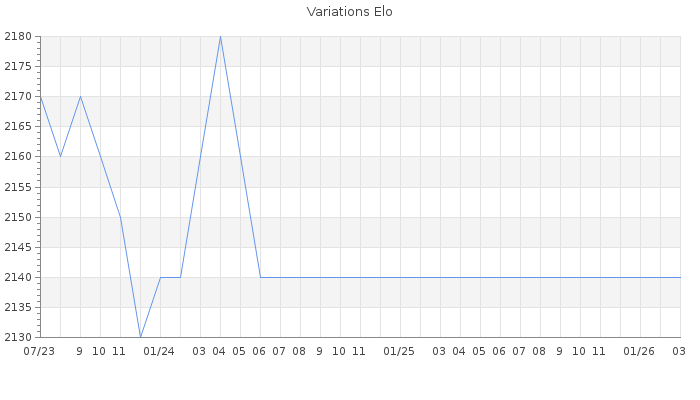 Date d'inscription : 05/07/23. Donateur pour EchecsEmail : Non ( Cliquez ici pour soutenir EchecsEmail. ) Elo non arrondi:2104.9 ( 85 sur 445 joueurs ) Nombre de victoires :67 Nombre de nulles :17 Nombre de défaites :24 Temps de réponse moyen par coup : 0J 4H 19M 29S ( Moyenne sur 0 coups ). Rd ( Un petit rd indique un elo fiable ) : 73 Magic Elo:1700 Magic Rd : 350 Elo maximum atteint ( en étant classé ) :2190 Elo maximum atteint cette année :0 Nombre coups joués : 4102 Classement coupe : Inactif Points coupe : 0 Classement Coupe Magic Chess : Inactif Points Coupe Magic Chess : 0 Tournoi échelle : Inactif. Tournois gagnés : 10/04/2024 : Cat 5 : Victoire dans le tournoi n°25685 20/03/2024 : Cat 5 : Victoire dans le tournoi n°25580 21/01/2024 : Cat 5 : Victoire dans le tournoi n°25506 30/07/2023 : Cat 4 : Victoire dans le tournoi n°25089 19/07/2023 : Cat 3 : Victoire dans le tournoi n°25063 Nombre de tournois gagnés :5