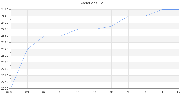 Date d'inscription : 02/02/25. Donateur pour EchecsEmail : Non ( Cliquez ici pour soutenir EchecsEmail. ) Elo non arrondi:2460.3 ( 25 sur 449 joueurs ) Nombre de victoires :87 Nombre de nulles :29 Nombre de défaites :9 Temps de réponse moyen par coup : 0J 12H 17M 10S ( Moyenne sur 532 coups ). Rd ( Un petit rd indique un elo fiable ) : 64 Elo maximum atteint ( en étant classé ) :2460 Elo maximum atteint cette année :2460 Nombre coups joués : 3484 Classement coupe : 12 Points coupe : 6312.71 Classement Coupe Magic Chess : Inactif Points Coupe Magic Chess : 0 Tournoi échelle : Nombre de tournois gagnés :0