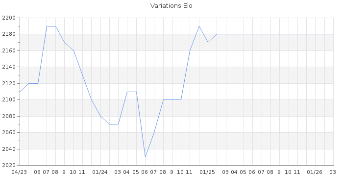 Date d'inscription : 20/11/10. Donateur pour EchecsEmail : Non ( Cliquez ici pour soutenir EchecsEmail. ) Elo non arrondi:2146.1 ( 81 sur 439 joueurs ) Nombre de victoires :299 Nombre de nulles :90 Nombre de défaites :225 Temps de réponse moyen par coup : 0J 16H 6M 39S ( Moyenne sur 1 coups ). Rd ( Un petit rd indique un elo fiable ) : 86 Magic Elo:1600 Magic Rd : 350 Elo maximum atteint ( en étant classé ) :2250 Elo maximum atteint cette année :0 Nombre coups joués : 18578 Classement coupe : Inactif, date de la dernière qualification : 24/07/23 Points coupe : 13.74 Classement Coupe Magic Chess : Inactif Points Coupe Magic Chess : 0 Tournoi échelle : Inactif. Tournois gagnés : 18/11/2014 : Cat 4 : Victoire dans le tournoi n°16285 02/09/2013 : Cat 4 : Victoire dans le tournoi n°13089 13/12/2012 : Cat 5 : Victoire dans le tournoi n°11115 Nombre de tournois gagnés :3