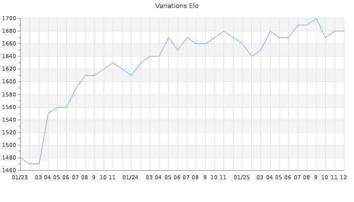 Date d'inscription : 18/07/19. Donateur pour EchecsEmail : Non ( Cliquez ici pour soutenir EchecsEmail. ) Elo non arrondi:1684.1 ( 285 sur 448 joueurs ) Nombre de victoires :62 Nombre de nulles :34 Nombre de défaites :13 Temps de réponse moyen par coup : 0J 3H 52M 49S ( Moyenne sur 188 coups ). Rd ( Un petit rd indique un elo fiable ) : 86 Elo maximum atteint ( en étant classé ) :1710 Elo maximum atteint cette année :1710 Nombre coups joués : 3368 Classement coupe : Inactif Points coupe : 0 Classement Coupe Magic Chess : Inactif Points Coupe Magic Chess : 0 Tournoi échelle : Nombre de tournois gagnés :0
