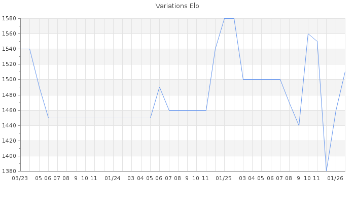 Date d'inscription : 17/08/18. Donateur pour EchecsEmail : Non ( Cliquez ici pour soutenir EchecsEmail. ) Elo non arrondi:1506.9 ( 368 sur 459 joueurs ) Nombre de victoires :541 Nombre de nulles :39 Nombre de défaites :514 Temps de réponse moyen par coup : 0J 6H 58M 52S ( Moyenne sur 2303 coups ). Rd ( Un petit rd indique un elo fiable ) : 52 Magic Elo:1700 Magic Rd : 350 Elo maximum atteint ( en étant classé ) :1700 Elo maximum atteint cette année :1510 Nombre coups joués : 24439 Classement coupe : 133 Points coupe : 14.81 Classement Coupe Magic Chess : Inactif Points Coupe Magic Chess : 0 Tournoi échelle : Inactif. Tournois gagnés : 04/02/2026 : Cat 1 : Victoire dans le tournoi n°27414 31/01/2026 : Cat 1 : Victoire dans le tournoi n°27397 20/01/2026 : Cat 1 : Victoire dans le tournoi n°27352 09/11/2025 : Cat 2 : Victoire dans le tournoi n°27169 06/11/2025 : Cat 1 : Victoire dans le tournoi n°27156 30/10/2025 : Cat 1 : Victoire dans le tournoi n°27118 29/10/2025 : Cat 2 : Victoire dans le tournoi n°27163 26/10/2025 : Cat 2 : Premier au tournoi multi Automne 2025 n°4 23/10/2025 : Cat 2 : Victoire dans le tournoi n°27134 18/10/2025 : Cat 1 : Victoire dans le tournoi n°27080 17/10/2025 : Cat 1 : Victoire dans le tournoi n°27099 16/10/2025 : Cat 2 : Victoire dans le tournoi n°27123 04/10/2025 : Cat 1 : Victoire dans le tournoi n°27070 26/09/2025 : Cat 1 : Victoire dans le tournoi n°27046 18/02/2025 : Cat 2 : Victoire dans le tournoi n°26354 10/02/2025 : Cat 2 : Victoire dans le tournoi n°26470 01/02/2025 : Cat 2 : Victoire dans le tournoi n°26426 11/01/2025 : Cat 1 : Victoire dans le tournoi n°26343 23/05/2023 : Cat 2 : Victoire dans le tournoi n°24848 16/05/2023 : Cat 2 : Victoire dans le tournoi n°24813 22/04/2023 : Cat 2 : Victoire dans le tournoi n°24759 11/04/2023 : Cat 2 : Victoire dans le tournoi n°24741 26/03/2023 : Cat 1 : Victoire dans le tournoi n°24715 09/03/2023 : Cat 1 : Victoire dans le tournoi n°24650 02/03/2023 : Cat 2 : Victoire dans le tournoi n°24659 02/03/2023 : Cat 1 : Victoire dans le tournoi n°24623 11/09/2022 : Cat 1 : Victoire dans le tournoi n°24144 02/08/2022 : Cat 2 : Victoire dans le tournoi n°24127 04/07/2021 : Cat 2 : Victoire dans le tournoi n°22886 27/06/2021 : Cat 2 : Victoire dans le tournoi n°22868 26/06/2021 : Cat 2 : Victoire dans le tournoi n°22879 20/06/2021 : Cat 2 : Victoire dans le tournoi n°22857 15/05/2021 : Cat 1 : Victoire dans le tournoi n°22734 17/02/2021 : Cat 2 : Victoire dans le tournoi n°22393 12/02/2021 : Cat 1 : Victoire dans le tournoi n°22409 17/12/2020 : Cat 2 : Victoire dans le tournoi n°22023 25/11/2020 : Cat 2 : Victoire dans le tournoi n°22028 31/08/2020 : Cat 1 : Victoire dans le tournoi n°21577 13/08/2020 : Cat 1 : Victoire dans le tournoi n°21491 03/08/2020 : Cat 1 : Victoire dans le tournoi n°21538 02/08/2020 : Cat 1 : Victoire dans le tournoi n°21555 27/07/2020 : Cat 1 : Victoire dans le tournoi n°21571 30/06/2019 : Cat 2 : Victoire dans le tournoi n°19610 29/05/2019 : Cat 2 : Victoire dans le tournoi n°19632 23/05/2019 : Cat 2 : Victoire dans le tournoi n°19593 10/05/2019 : Cat 2 : Victoire dans le tournoi n°19629 07/11/2018 : Cat 2 : Victoire CC Oct18 Asc 31/10/2018 : Cat 2 : Victoire dans le tournoi n°18794 06/09/2018 : Cat 1 : Victoire dans le tournoi n°18571 02/09/2018 : Cat 1 : Victoire dans le tournoi n°18584 Nombre de tournois gagnés :51