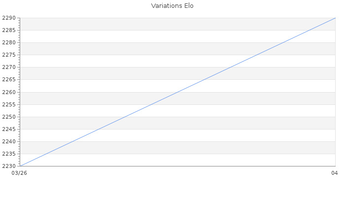 Date d'inscription : 01/03/26. Donateur pour EchecsEmail : Oui ( Cliquez ici pour soutenir EchecsEmail. ) Elo non arrondi:2292.2 ( 46 sur 453 joueurs ) Nombre de victoires :43 Nombre de nulles :4 Nombre de défaites :1 Temps de réponse moyen par coup : 0J 0H 36M 23S ( Moyenne sur 1289 coups ). Rd ( Un petit rd indique un elo fiable ) : 72 Elo maximum atteint ( en étant classé ) :2290 Elo maximum atteint cette année :2290 Nombre coups joués : 1856 Classement coupe : 45 Points coupe : 688 Classement Coupe Magic Chess : Inactif Points Coupe Magic Chess : 0 Tournoi échelle : Tournois gagnés : 11/04/2026 : Cat 5 : Victoire dans le tournoi n°27524 23/03/2026 : Cat 2 : Victoire dans le tournoi n°27516 18/03/2026 : Cat 1 : Victoire dans le tournoi n°27515 16/03/2026 : Cat 4 : Victoire dans le tournoi n°27530 11/03/2026 : Cat 3 : Victoire dans le tournoi n°27509 Nombre de tournois gagnés :5