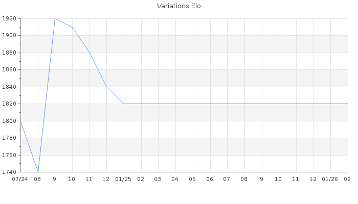 Date d'inscription : 28/07/24. Donateur pour EchecsEmail : Non ( Cliquez ici pour soutenir EchecsEmail. ) Elo non arrondi:1794.3 ( 245 sur 454 joueurs ) Nombre de victoires :21 Nombre de nulles :3 Nombre de défaites :37 Temps de réponse moyen par coup : 0J 5H 30M 28S ( Moyenne sur 2 coups ). Rd ( Un petit rd indique un elo fiable ) : 66 Elo maximum atteint ( en étant classé ) :1960 Elo maximum atteint cette année :0 Nombre coups joués : 2326 Classement coupe : Inactif Points coupe : 0 Classement Coupe Magic Chess : Inactif Points Coupe Magic Chess : 0 Tournoi échelle : Nombre de tournois gagnés :0