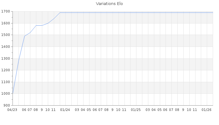Date d'inscription : 21/04/23. Donateur pour EchecsEmail : Non ( Cliquez ici pour soutenir EchecsEmail. ) Elo non arrondi:1656.4 ( 335 sur 459 joueurs ) Nombre de victoires :11 Nombre de nulles :0 Nombre de défaites :1 Temps de réponse moyen par coup : 0J 10H 3M 33S ( Moyenne sur 0 coups ). Rd ( Un petit rd indique un elo fiable ) : 117 Elo maximum atteint ( en étant classé ) :1730 Elo maximum atteint cette année :0 Nombre coups joués : 448 Classement coupe : Inactif Points coupe : 0 Classement Coupe Magic Chess : Inactif Points Coupe Magic Chess : 0 Tournoi échelle : Nombre de tournois gagnés :0