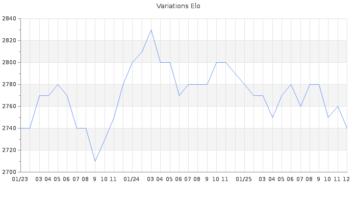 Date d'inscription : 26/09/18. Donateur pour EchecsEmail : Non ( Cliquez ici pour soutenir EchecsEmail. ) Elo non arrondi:2744.1 ( 11 sur 460 joueurs ) Nombre de victoires :250 Nombre de nulles :214 Nombre de défaites :19 Temps de réponse moyen par coup : 0J 13H 7M 28S ( Moyenne sur 339 coups ). Rd ( Un petit rd indique un elo fiable ) : 80 Elo maximum atteint ( en étant classé ) :2830 Elo maximum atteint cette année :2790 Nombre coups joués : 17265 Inscrit dans l' équipe:les modestes Classement coupe : 2 Points coupe : 21560.1 Classement Coupe Magic Chess : Inactif Points Coupe Magic Chess : 0 Tournoi échelle : Inactif. Tournois gagnés : 31/10/2018 : Cat 4 : Victoire dans le tournoi n°18747 Nombre de tournois gagnés :1