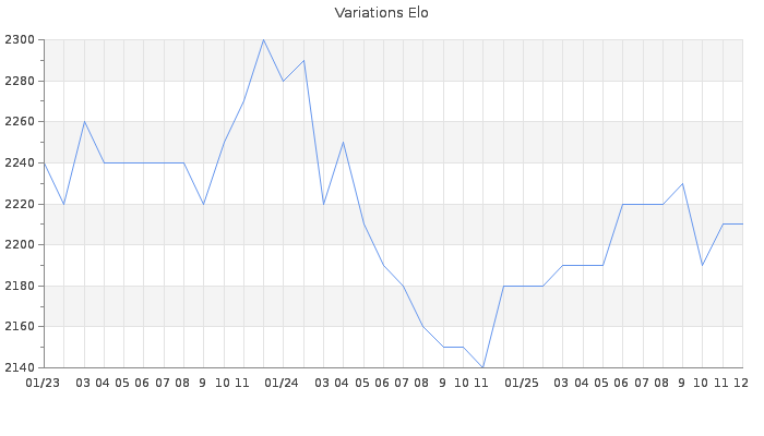 Date d'inscription : 20/01/20. Donateur pour EchecsEmail : Non ( Cliquez ici pour soutenir EchecsEmail. ) Elo non arrondi:2205.5 ( 55 sur 448 joueurs ) Nombre de victoires :252 Nombre de nulles :31 Nombre de défaites :120 Temps de réponse moyen par coup : 0J 18H 36M 19S ( Moyenne sur 488 coups ). Rd ( Un petit rd indique un elo fiable ) : 80 Magic Elo:1700 Magic Rd : 350 Elo maximum atteint ( en étant classé ) :2310 Elo maximum atteint cette année :2230 Nombre coups joués : 15169 Inscrit dans l' équipe:modesty Classement coupe : Inactif Points coupe : 0.06 Classement Coupe Magic Chess : Inactif Points Coupe Magic Chess : 0 Tournoi échelle : Tournois gagnés : 09/11/2025 : Cat 5 : Victoire dans le tournoi n°26987 29/10/2024 : Cat 5 : Victoire dans le tournoi n°26057 29/12/2023 : Cat 5 : Victoire dans le tournoi n°25335 21/12/2020 : Cat 5 : Victoire dans le tournoi n°21942 15/05/2020 : Cat 4 : Victoire dans le tournoi n°20962 08/03/2020 : Cat 4 : Victoire dans le tournoi n°20822 28/02/2020 : Cat 2 : Victoire dans le tournoi n°20708 Nombre de tournois gagnés :7
