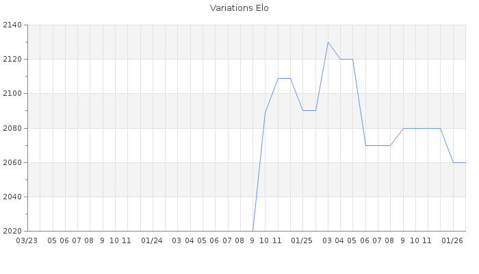 Date d'inscription : 24/11/11. Donateur pour EchecsEmail : Non ( Cliquez ici pour soutenir EchecsEmail. ) Elo non arrondi:2057.1 ( 110 sur 463 joueurs ) Nombre de victoires :357 Nombre de nulles :28 Nombre de défaites :216 Temps de réponse moyen par coup : 1J 14H 33M 10S ( Moyenne sur 21 coups ). Rd ( Un petit rd indique un elo fiable ) : 120 Magic Elo:1600 Magic Rd : 350 Elo maximum atteint ( en étant classé ) :2200 Elo maximum atteint cette année :2060 Nombre coups joués : 18417 Inscrit dans l' équipe:Danielsen City Classement coupe : Inactif Points coupe : 0.21 Classement Coupe Magic Chess : Inactif Points Coupe Magic Chess : 0 Tournoi échelle : Inactif. Tournois gagnés : 27/10/2020 : Cat 4 : Victoire dans le tournoi n°21824 31/08/2020 : Cat 4 : Victoire dans le tournoi n°21644 Nombre de tournois gagnés :2