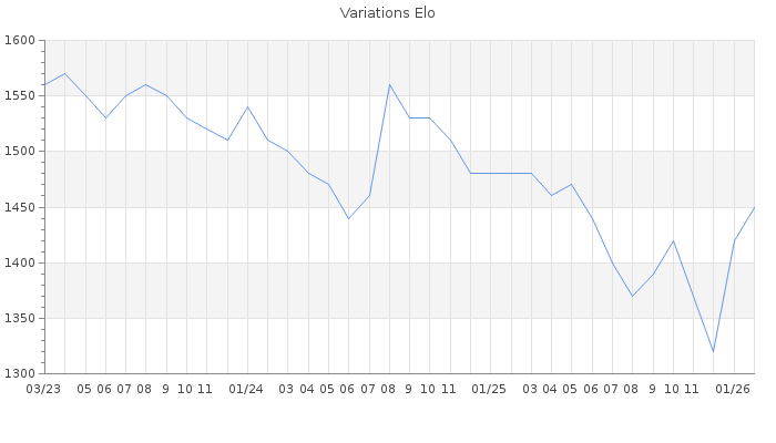 Date d'inscription : 31/08/06. Donateur pour EchecsEmail : Non ( Cliquez ici pour soutenir EchecsEmail. ) Elo non arrondi:1449.4 ( 389 sur 463 joueurs ) Nombre de victoires :657 Nombre de nulles :52 Nombre de défaites :655 Temps de réponse moyen par coup : 0J 11H 24M 59S ( Moyenne sur 389 coups ). Rd ( Un petit rd indique un elo fiable ) : 85 Magic Elo:1600 Magic Rd : 350 Elo maximum atteint ( en étant classé ) :1790 Elo maximum atteint cette année :1460 Nombre coups joués : 44198 Classement coupe : Inactif Points coupe : 0 Classement Coupe Magic Chess : Inactif Points Coupe Magic Chess : 0 Tournoi échelle : Tournois gagnés : 25/11/2006 : Cat 1 : Victoire dans le tournoi n°3362 17/05/2006 : Cat 1 : Victoire dans le tournoi n°2675 Nombre de tournois gagnés :2