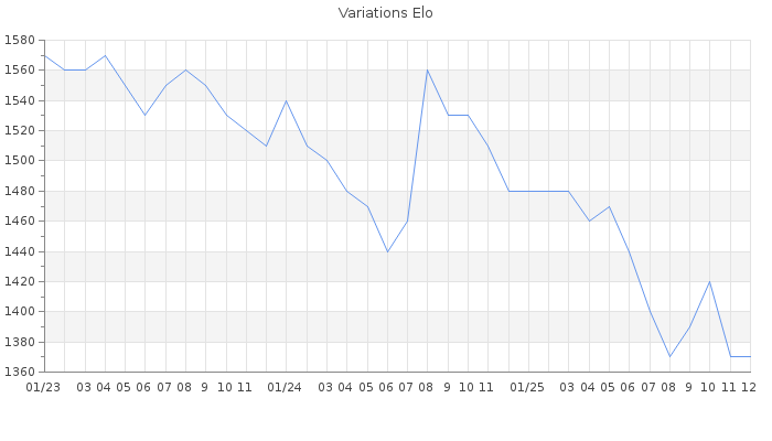 Date d'inscription : 31/08/06. Donateur pour EchecsEmail : Non ( Cliquez ici pour soutenir EchecsEmail. ) Elo non arrondi:1365.7 ( 405 sur 448 joueurs ) Nombre de victoires :652 Nombre de nulles :52 Nombre de défaites :647 Temps de réponse moyen par coup : 0J 15H 21M 38S ( Moyenne sur 211 coups ). Rd ( Un petit rd indique un elo fiable ) : 91 Magic Elo:1600 Magic Rd : 350 Elo maximum atteint ( en étant classé ) :1790 Elo maximum atteint cette année :1480 Nombre coups joués : 43771 Classement coupe : Inactif Points coupe : 0 Classement Coupe Magic Chess : Inactif Points Coupe Magic Chess : 0 Tournoi échelle : Tournois gagnés : 25/11/2006 : Cat 1 : Victoire dans le tournoi n°3362 17/05/2006 : Cat 1 : Victoire dans le tournoi n°2675 Nombre de tournois gagnés :2