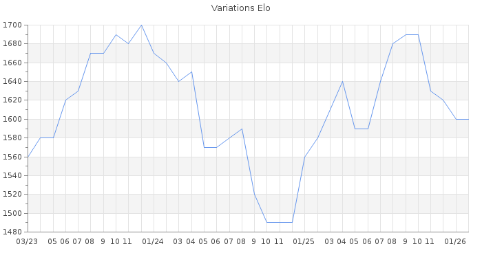 Date d'inscription : 05/03/11. Donateur pour EchecsEmail : Oui ( Cliquez ici pour soutenir EchecsEmail. ) Elo non arrondi:1601.9 ( 333 sur 463 joueurs ) Nombre de victoires :458 Nombre de nulles :53 Nombre de défaites :457 Temps de réponse moyen par coup : 0J 15H 19M 45S ( Moyenne sur 318 coups ). Rd ( Un petit rd indique un elo fiable ) : 70 Magic Elo:1600 Magic Rd : 350 Elo maximum atteint ( en étant classé ) :1800 Elo maximum atteint cette année :1600 Nombre coups joués : 25282 Classement coupe : Inactif Points coupe : 0.23 Classement Coupe Magic Chess : Inactif Points Coupe Magic Chess : 0 Tournoi échelle : Inactif. Tournois gagnés : 30/08/2025 : Cat 2 : Victoire dans le tournoi n°26929 17/07/2025 : Cat 2 : Victoire dans le tournoi n°26888 23/03/2025 : Cat 2 : Victoire dans le tournoi n°26545 25/02/2025 : Cat 2 : Victoire dans le tournoi n°26464 25/01/2025 : Cat 2 : Victoire dans le tournoi n°26288 01/11/2023 : Cat 2 : Victoire dans le tournoi n°25256 22/10/2023 : Cat 2 : Victoire dans le tournoi n°25000 31/08/2023 : Cat 2 : Victoire dans le tournoi n°25004 11/06/2023 : Cat 2 : Victoire dans le tournoi n°24909 10/06/2023 : Cat 2 : Victoire dans le tournoi n°24633 16/11/2022 : Cat 2 : Victoire dans le tournoi n°24364 20/05/2022 : Cat 2 : Victoire dans le tournoi n°23864 16/11/2021 : Cat 2 : Victoire dans le tournoi n°22866 23/08/2021 : Cat 2 : Victoire dans le tournoi n°23062 02/05/2021 : Cat 2 : Victoire dans le tournoi n°22431 03/04/2021 : Cat 2 : Victoire dans le tournoi n°22410 23/01/2021 : Cat 1 : Victoire dans le tournoi n°22262 01/04/2019 : Cat 2 : Victoire dans le tournoi n°19157 02/01/2019 : Cat 2 : Victoire dans le tournoi n°19103 10/11/2018 : Cat 2 : Victoire dans le tournoi n°18205 23/10/2014 : Cat 2 : Victoire dans le tournoi n°15711 24/06/2011 : Cat 1 : Victoire dans le tournoi n°8704 Nombre de tournois gagnés :22