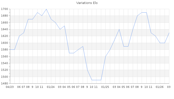 Date d'inscription : 05/03/11. Donateur pour EchecsEmail : Oui ( Cliquez ici pour soutenir EchecsEmail. ) Elo non arrondi:1626.2 ( 303 sur 441 joueurs ) Nombre de victoires :461 Nombre de nulles :53 Nombre de défaites :458 Temps de réponse moyen par coup : 0J 18H 52M 54S ( Moyenne sur 249 coups ). Rd ( Un petit rd indique un elo fiable ) : 78 Magic Elo:1600 Magic Rd : 350 Elo maximum atteint ( en étant classé ) :1800 Elo maximum atteint cette année :1630 Nombre coups joués : 25390 Classement coupe : Inactif Points coupe : 0.22 Classement Coupe Magic Chess : Inactif Points Coupe Magic Chess : 0 Tournoi échelle : Inactif. Tournois gagnés : 15/03/2026 : Cat 2 : Victoire dans le tournoi n°27167 30/08/2025 : Cat 2 : Victoire dans le tournoi n°26929 17/07/2025 : Cat 2 : Victoire dans le tournoi n°26888 23/03/2025 : Cat 2 : Victoire dans le tournoi n°26545 25/02/2025 : Cat 2 : Victoire dans le tournoi n°26464 25/01/2025 : Cat 2 : Victoire dans le tournoi n°26288 01/11/2023 : Cat 2 : Victoire dans le tournoi n°25256 22/10/2023 : Cat 2 : Victoire dans le tournoi n°25000 31/08/2023 : Cat 2 : Victoire dans le tournoi n°25004 11/06/2023 : Cat 2 : Victoire dans le tournoi n°24909 10/06/2023 : Cat 2 : Victoire dans le tournoi n°24633 16/11/2022 : Cat 2 : Victoire dans le tournoi n°24364 20/05/2022 : Cat 2 : Victoire dans le tournoi n°23864 16/11/2021 : Cat 2 : Victoire dans le tournoi n°22866 23/08/2021 : Cat 2 : Victoire dans le tournoi n°23062 02/05/2021 : Cat 2 : Victoire dans le tournoi n°22431 03/04/2021 : Cat 2 : Victoire dans le tournoi n°22410 23/01/2021 : Cat 1 : Victoire dans le tournoi n°22262 01/04/2019 : Cat 2 : Victoire dans le tournoi n°19157 02/01/2019 : Cat 2 : Victoire dans le tournoi n°19103 10/11/2018 : Cat 2 : Victoire dans le tournoi n°18205 23/10/2014 : Cat 2 : Victoire dans le tournoi n°15711 24/06/2011 : Cat 1 : Victoire dans le tournoi n°8704 Nombre de tournois gagnés :23