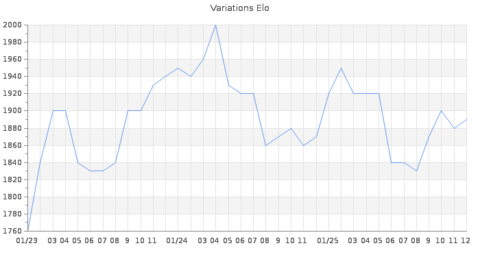 Date d'inscription : 02/12/07. Donateur pour EchecsEmail : Oui ( Cliquez ici pour soutenir EchecsEmail. ) Elo non arrondi:1893.1 ( 184 sur 458 joueurs ) Nombre de victoires :3893 Nombre de nulles :783 Nombre de défaites :4187 Temps de réponse moyen par coup : 0J 2H 36M 45S ( Moyenne sur 2377 coups ). Rd ( Un petit rd indique un elo fiable ) : 50 Magic Elo:1600 Magic Rd : 350 Elo maximum atteint ( en étant classé ) :2000 Elo maximum atteint cette année :1970 Nombre coups joués : 264565 Classement coupe : Inactif Points coupe : 0 Classement Coupe Magic Chess : Inactif Points Coupe Magic Chess : 0 Tournoi échelle : Inactif. Tournois gagnés : 01/09/2025 : Cat 4 : Victoire dans le tournoi n°26972 20/01/2025 : Cat 3 : Premier au tournoi multi Noël 2024 n°5 15/01/2025 : Cat 3 : Victoire dans le tournoi n°26375 15/12/2024 : Cat 3 : Victoire dans le tournoi n°26214 06/10/2024 : Cat 4 : Victoire dans le tournoi n°26098 12/07/2024 : Cat 4 : Victoire dans le tournoi n°25707 27/03/2024 : Cat 4 : Victoire dans le tournoi n°25533 07/01/2024 : Cat 4 : Victoire dans le tournoi n°25399 22/11/2023 : Cat 4 : Victoire dans le tournoi n°25220 05/05/2023 : Cat 4 : Victoire dans le tournoi n°24812 27/02/2023 : Cat 3 : Victoire dans le tournoi n°24620 25/02/2023 : Cat 3 : Victoire dans le tournoi n°24609 22/02/2023 : Cat 3 : Victoire dans le tournoi n°24647 23/11/2022 : Cat 3 : Victoire dans le tournoi n°24256 27/08/2022 : Cat 3 : Victoire dans le tournoi n°24164 24/07/2022 : Cat 3 : Victoire dans le tournoi n°24098 27/05/2022 : Cat 3 : Victoire dans le tournoi n°23735 12/05/2022 : Cat 3 : Victoire dans le tournoi n°23762 01/04/2022 : Cat 3 : Victoire dans le tournoi n°23590 10/03/2022 : Cat 3 : Victoire dans le tournoi n°23625 06/01/2022 : Cat 3 : Victoire dans le tournoi n°23268 30/10/2021 : Cat 2 : Victoire dans le tournoi n°23050 27/10/2021 : Cat 2 : Victoire dans le tournoi n°23227 15/10/2021 : Cat 2 : Victoire dans le tournoi n°23076 01/09/2021 : Cat 2 : Victoire dans le tournoi n°23065 25/08/2021 : Cat 2 : Victoire dans le tournoi n°22972 14/08/2021 : Cat 2 : Victoire dans le tournoi n°23058 16/08/2020 : Cat 3 : Victoire dans le tournoi n°21394 10/06/2020 : Cat 3 : Victoire dans le tournoi n°21341 15/03/2020 : Cat 3 : Victoire dans le tournoi n°20899 10/12/2019 : Cat 3 : Victoire dans le tournoi n°20336 09/12/2019 : Cat 3 : Victoire dans le tournoi n°20460 08/12/2019 : Cat 2 : Victoire dans le tournoi n°20337 15/11/2019 : Cat 3 : Victoire dans le tournoi n°20379 14/11/2019 : Cat 3 : Victoire dans le tournoi n°20285 11/11/2019 : Cat 2 : Victoire dans le tournoi n°20233 06/11/2019 : Cat 2 : Victoire dans le tournoi n°20222 05/11/2019 : Cat 3 : Victoire dans le tournoi n°20236 03/10/2019 : Cat 2 : Victoire dans le tournoi n°20209 24/09/2019 : Cat 2 : Victoire dans le tournoi n°20204 21/03/2019 : Cat 3 : Victoire dans le tournoi n°19418 29/01/2019 : Cat 3 : Victoire dans le tournoi n°18813 26/10/2018 : Cat 3 : Victoire dans le tournoi n°18700 18/10/2018 : Cat 3 : Victoire dans le tournoi n°18597 06/09/2018 : Cat 3 : Victoire dans le tournoi n°18189 11/08/2018 : Cat 2 : Victoire dans le tournoi n°18129 05/07/2018 : Cat 2 : Victoire dans le tournoi n°18108 13/06/2018 : Cat 2 : Victoire dans le tournoi n°18053 07/05/2018 : Cat 2 : Victoire dans le tournoi n°17880 21/03/2018 : Cat 2 : Victoire dans le tournoi n°17567 19/03/2018 : Cat 2 : Victoire dans le tournoi n°17761 07/03/2018 : Cat 2 : Victoire dans le tournoi n°17575 19/02/2018 : Cat 2 : Victoire dans le tournoi n°17686 10/10/2017 : Cat 2 : Victoire dans le tournoi n°16986 26/09/2017 : Cat 1 : Victoire dans le tournoi n°16863 18/09/2017 : Cat 1 : Victoire dans le tournoi n°16894 12/09/2017 : Cat 2 : Victoire dans le tournoi n°16905 10/09/2017 : Cat 2 : Victoire dans le tournoi n°17013 08/09/2017 : Cat 2 : Victoire dans le tournoi n°16941 06/09/2017 : Cat 1 : Victoire dans le tournoi n°16879 03/09/2017 : Cat 1 : Victoire dans le tournoi n°16900 02/09/2017 : Cat 2 : Victoire dans le tournoi n°16921 01/09/2017 : Cat 1 : Victoire dans le tournoi n°16851 22/08/2017 : Cat 1 : Victoire dans le tournoi n°16868 19/08/2017 : Cat 2 : Victoire dans le tournoi n°16897 31/07/2017 : Cat 1 : Victoire dans le tournoi n°16848 13/03/2017 : Cat 2 : Victoire dans le tournoi n°15947 05/03/2017 : Cat 2 : Victoire dans le tournoi n°15944 26/02/2017 : Cat 2 : Victoire dans le tournoi n°15954 15/02/2017 : Cat 2 : Victoire dans le tournoi n°15961 27/01/2017 : Cat 2 : Victoire dans le tournoi n°15946 11/01/2017 : Cat 2 : Victoire dans le tournoi n°15827 11/01/2017 : Cat 2 : Victoire dans le tournoi n°15719 06/01/2017 : Cat 2 : Victoire dans le tournoi n°15860 30/12/2016 : Cat 2 : Victoire dans le tournoi n°15906 29/12/2016 : Cat 2 : Victoire dans le tournoi n°15775 27/11/2016 : Cat 2 : Victoire dans le tournoi n°15521 14/10/2016 : Cat 2 : Victoire dans le tournoi n°15419 05/09/2016 : Cat 2 : Victoire dans le tournoi n°15081 27/07/2016 : Cat 2 : Victoire dans le tournoi n°15003 21/04/2016 : Cat 2 : Victoire dans le tournoi n°14470 18/04/2016 : Cat 2 : Victoire dans le tournoi n°14480 25/03/2016 : Cat 2 : Victoire dans le tournoi n°14355 28/02/2016 : Cat 2 : Victoire dans le tournoi n°14200 03/01/2016 : Cat 2 : Victoire dans le tournoi n°18651 08/11/2015 : Cat 2 : Victoire dans le tournoi n°18530 13/09/2015 : Cat 2 : Victoire dans le tournoi n°17914 16/07/2015 : Cat 2 : Victoire dans le tournoi n°17715 10/07/2015 : Cat 3 : Victoire dans le tournoi n°17743 08/07/2015 : Cat 2 : Victoire dans le tournoi n°17744 08/07/2015 : Cat 2 : Victoire dans le tournoi n°17647 14/05/2015 : Cat 2 : Victoire dans le tournoi n°17352 01/03/2015 : Cat 2 : Victoire dans le tournoi n°16943 25/02/2015 : Cat 2 : Victoire dans le tournoi n°16799 26/01/2015 : Cat 2 : Victoire dans le tournoi n°16473 03/01/2015 : Cat 2 : Victoire dans le tournoi n°16559 25/11/2014 : Cat 2 : Victoire dans le tournoi n°16353 19/