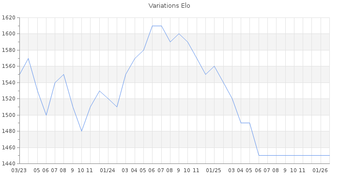 Date d'inscription : 26/12/16. Donateur pour EchecsEmail : Non ( Cliquez ici pour soutenir EchecsEmail. ) Elo non arrondi:1429.4 ( 409 sur 459 joueurs ) Nombre de victoires :329 Nombre de nulles :12 Nombre de défaites :297 Temps de réponse moyen par coup : 0J 5H 11M 23S ( Moyenne sur 6 coups ). Rd ( Un petit rd indique un elo fiable ) : 81 Elo maximum atteint ( en étant classé ) :1620 Elo maximum atteint cette année :0 Nombre coups joués : 23016 Classement coupe : Inactif Points coupe : 0 Classement Coupe Magic Chess : Inactif Points Coupe Magic Chess : 0 Tournoi échelle : Tournois gagnés : 16/12/2021 : Cat 2 : Victoire dans le tournoi n°23394 28/10/2021 : Cat 1 : Victoire dans le tournoi n°23273 27/10/2021 : Cat 1 : Victoire dans le tournoi n°23168 11/06/2021 : Cat 1 : Victoire dans le tournoi n°22793 19/05/2021 : Cat 1 : Victoire dans le tournoi n°22718 Nombre de tournois gagnés :5