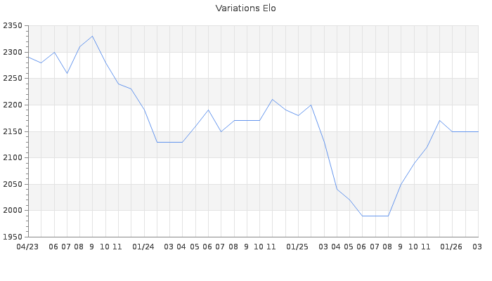 Date d'inscription : 20/03/20. Donateur pour EchecsEmail : Non ( Cliquez ici pour soutenir EchecsEmail. ) Elo non arrondi:2145.6 ( 71 sur 439 joueurs ) Nombre de victoires :292 Nombre de nulles :32 Nombre de défaites :89 Temps de réponse moyen par coup : 0J 4H 18M 38S ( Moyenne sur 609 coups ). Rd ( Un petit rd indique un elo fiable ) : 68 Elo maximum atteint ( en étant classé ) :2410 Elo maximum atteint cette année :2170 Nombre coups joués : 14749 Classement coupe : Inactif Points coupe : 0 Classement Coupe Magic Chess : Inactif Points Coupe Magic Chess : 0 Tournoi échelle : Nombre de tournois gagnés :0