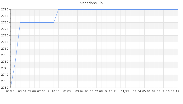 Date d'inscription : 14/07/15. Donateur pour EchecsEmail : Non ( Cliquez ici pour soutenir EchecsEmail. ) Elo non arrondi:2764.2 ( 11 sur 448 joueurs ) Nombre de victoires :45 Nombre de nulles :27 Nombre de défaites :11 Temps de réponse moyen par coup : 0J 14H 7M 12S ( Moyenne sur 0 coups ). Rd ( Un petit rd indique un elo fiable ) : 135 Magic Elo:1600 Magic Rd : 350 Elo maximum atteint ( en étant classé ) :2790 Elo maximum atteint cette année :0 Nombre coups joués : 2734 Classement coupe : Inactif, date de la dernière qualification : 05/08/23 Points coupe : 807.49 Classement Coupe Magic Chess : Inactif Points Coupe Magic Chess : 0 Tournoi échelle : Inactif. Tournois gagnés : 11/10/2015 : Cat 5 : Victoire dans le tournoi n°18290 31/08/2015 : Cat 4 : Victoire dans le tournoi n°18091 Nombre de tournois gagnés :2