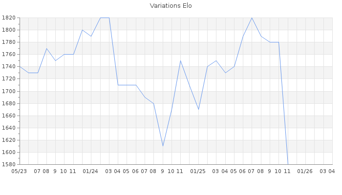Date d'inscription : 25/04/10. Donateur pour EchecsEmail : Oui ( Cliquez ici pour soutenir EchecsEmail. ) Elo non arrondi:1566.4 ( 233 sur 452 joueurs ) Nombre de victoires :964 Nombre de nulles :147 Nombre de défaites :849 Temps de réponse moyen par coup : 0J 15H 9M 48S ( Moyenne sur 40 coups ). Rd ( Un petit rd indique un elo fiable ) : 57 Magic Elo:1662.82 Magic Rd : 91 Elo maximum atteint ( en étant classé ) :1900 Elo maximum atteint cette année :0 Nombre coups joués : 69938 Classement coupe : 83 Points coupe : 152.39 Classement Coupe Magic Chess : Inactif Points Coupe Magic Chess : 0 Tournoi échelle : Inactif. Tournois gagnés : 24/07/2025 : Cat 3 : Victoire dans le tournoi n°26808 15/03/2025 : Cat 2 : Victoire dans le tournoi n°26526 07/03/2025 : Cat 2 : Victoire dans le tournoi n°26529 01/02/2025 : Cat 2 : Victoire dans le tournoi n°26419 08/12/2024 : Cat 3 : Victoire dans le tournoi n°26178 30/11/2024 : Cat 2 : Victoire dans le tournoi n°26221 21/11/2024 : Cat 2 : Victoire dans le tournoi n°26131 24/09/2024 : Cat 2 : Victoire dans le tournoi n°26073 19/01/2023 : Cat 1 : Premier au tournoi multi Noël 2022 n°2 18/01/2023 : Cat 2 : Victoire dans le tournoi n°24534 26/12/2022 : Cat 2 : Victoire dans le tournoi n°24401 22/10/2022 : Cat 2 : Victoire dans le tournoi n°24328 05/05/2022 : Cat 3 : Victoire dans le tournoi n°23686 02/01/2022 : Cat 2 : Victoire dans le tournoi n°23233 01/12/2021 : Cat 2 : Victoire dans le tournoi n°23319 25/07/2021 : Cat 2 : Victoire dans le tournoi n°22850 07/05/2021 : Cat 2 : Victoire dans le tournoi n°22655 26/04/2020 : Cat 2 : Victoire dans le tournoi n°20977 26/11/2019 : Cat 4 : Victoire dans le tournoi n°20196 28/07/2019 : Cat 3 : Victoire dans le tournoi n°19763 20/05/2019 : Cat 3 : Victoire dans le tournoi n°19606 18/04/2019 : Cat 3 : Victoire dans le tournoi n°19431 25/10/2018 : Cat 3 : Victoire dans le tournoi n°18687 09/07/2018 : Cat 2 : Victoire dans le tournoi n°18223 16/02/2015 : Cat 3 : Victoire dans le tournoi n°17016 03/11/2014 : Cat 2 : Victoire dans le tournoi n°15855 28/08/2014 : Cat 2 : Victoire dans le tournoi n°15498 08/03/2014 : Cat 2 : Victoire dans le tournoi n°14609 31/12/2013 : Cat 3 : Victoire dans le tournoi n°13766 01/12/2013 : Cat 3 : Victoire dans le tournoi n°13690 11/05/2013 : Cat 3 : Victoire dans le tournoi n°12339 12/02/2013 : Cat 3 : Victoire dans le tournoi n°11747 18/07/2012 : Cat 3 : Victoire dans le tournoi n°10374 10/03/2012 : Cat 3 : Victoire dans le tournoi n°9834 09/03/2012 : Cat 3 : Victoire dans le tournoi n°9854 05/02/2012 : Cat 2 : Victoire dans le tournoi n°9591 03/12/2011 : Cat 2 : Victoire dans le tournoi n°9509 19/04/2011 : Cat 0 : Premier au tournoi multi Printemps 2011 n°4 15/02/2011 : Cat 0 : Premier au tournoi multi Noel 2010 n°2 03/02/2011 : Cat 2 : Victoire dans le tournoi n°8264 21/01/2011 : Cat 2 : Victoire dans le tournoi n°8009 28/11/2010 : Cat 2 : Victoire dans le tournoi n°8022 10/11/2010 : Cat 2 : Victoire dans le tournoi n°7998 10/11/2010 : Cat 2 : Victoire dans le tournoi n°7579 28/10/2010 : Cat 2 : Victoire dans le tournoi n°7924 14/10/2010 : Cat 2 : Victoire dans le tournoi n°7886 29/09/2010 : Cat 2 : Victoire dans le tournoi n°7837 17/09/2010 : Cat 2 : Victoire dans le tournoi n°7741 16/09/2010 : Cat 2 : Victoire dans le tournoi n°7685 27/07/2010 : Cat 2 : Victoire dans le tournoi n°7468 09/06/2010 : Cat 1 : Victoire dans le tournoi n°7319 Nombre de tournois gagnés :52