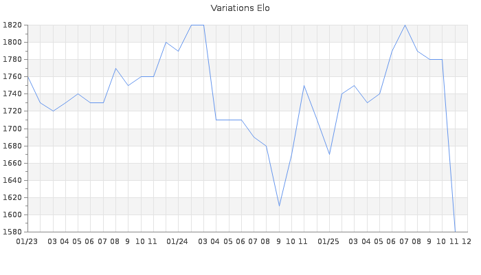 Date d'inscription : 25/04/10. Donateur pour EchecsEmail : Oui ( Cliquez ici pour soutenir EchecsEmail. ) Elo non arrondi:1575.4 ( 233 sur 449 joueurs ) Nombre de victoires :964 Nombre de nulles :147 Nombre de défaites :849 Temps de réponse moyen par coup : 0J 15H 9M 48S ( Moyenne sur 329 coups ). Rd ( Un petit rd indique un elo fiable ) : 57 Magic Elo:1662.82 Magic Rd : 91 Elo maximum atteint ( en étant classé ) :1900 Elo maximum atteint cette année :1830 Nombre coups joués : 69938 Inscrit dans l' équipe:fouschess Classement coupe : 83 Points coupe : 187.1 Classement Coupe Magic Chess : Inactif Points Coupe Magic Chess : 0 Tournoi échelle : Inactif. Tournois gagnés : 24/07/2025 : Cat 3 : Victoire dans le tournoi n°26808 15/03/2025 : Cat 2 : Victoire dans le tournoi n°26526 07/03/2025 : Cat 2 : Victoire dans le tournoi n°26529 01/02/2025 : Cat 2 : Victoire dans le tournoi n°26419 08/12/2024 : Cat 3 : Victoire dans le tournoi n°26178 30/11/2024 : Cat 2 : Victoire dans le tournoi n°26221 21/11/2024 : Cat 2 : Victoire dans le tournoi n°26131 24/09/2024 : Cat 2 : Victoire dans le tournoi n°26073 19/01/2023 : Cat 1 : Premier au tournoi multi Noël 2022 n°2 18/01/2023 : Cat 2 : Victoire dans le tournoi n°24534 26/12/2022 : Cat 2 : Victoire dans le tournoi n°24401 22/10/2022 : Cat 2 : Victoire dans le tournoi n°24328 05/05/2022 : Cat 3 : Victoire dans le tournoi n°23686 02/01/2022 : Cat 2 : Victoire dans le tournoi n°23233 01/12/2021 : Cat 2 : Victoire dans le tournoi n°23319 25/07/2021 : Cat 2 : Victoire dans le tournoi n°22850 07/05/2021 : Cat 2 : Victoire dans le tournoi n°22655 26/04/2020 : Cat 2 : Victoire dans le tournoi n°20977 26/11/2019 : Cat 4 : Victoire dans le tournoi n°20196 28/07/2019 : Cat 3 : Victoire dans le tournoi n°19763 20/05/2019 : Cat 3 : Victoire dans le tournoi n°19606 18/04/2019 : Cat 3 : Victoire dans le tournoi n°19431 25/10/2018 : Cat 3 : Victoire dans le tournoi n°18687 09/07/2018 : Cat 2 : Victoire dans le tournoi n°18223 16/02/2015 : Cat 3 : Victoire dans le tournoi n°17016 03/11/2014 : Cat 2 : Victoire dans le tournoi n°15855 28/08/2014 : Cat 2 : Victoire dans le tournoi n°15498 08/03/2014 : Cat 2 : Victoire dans le tournoi n°14609 31/12/2013 : Cat 3 : Victoire dans le tournoi n°13766 01/12/2013 : Cat 3 : Victoire dans le tournoi n°13690 11/05/2013 : Cat 3 : Victoire dans le tournoi n°12339 12/02/2013 : Cat 3 : Victoire dans le tournoi n°11747 18/07/2012 : Cat 3 : Victoire dans le tournoi n°10374 10/03/2012 : Cat 3 : Victoire dans le tournoi n°9834 09/03/2012 : Cat 3 : Victoire dans le tournoi n°9854 05/02/2012 : Cat 2 : Victoire dans le tournoi n°9591 03/12/2011 : Cat 2 : Victoire dans le tournoi n°9509 19/04/2011 : Cat 0 : Premier au tournoi multi Printemps 2011 n°4 15/02/2011 : Cat 0 : Premier au tournoi multi Noel 2010 n°2 03/02/2011 : Cat 2 : Victoire dans le tournoi n°8264 21/01/2011 : Cat 2 : Victoire dans le tournoi n°8009 28/11/2010 : Cat 2 : Victoire dans le tournoi n°8022 10/11/2010 : Cat 2 : Victoire dans le tournoi n°7998 10/11/2010 : Cat 2 : Victoire dans le tournoi n°7579 28/10/2010 : Cat 2 : Victoire dans le tournoi n°7924 14/10/2010 : Cat 2 : Victoire dans le tournoi n°7886 29/09/2010 : Cat 2 : Victoire dans le tournoi n°7837 17/09/2010 : Cat 2 : Victoire dans le tournoi n°7741 16/09/2010 : Cat 2 : Victoire dans le tournoi n°7685 27/07/2010 : Cat 2 : Victoire dans le tournoi n°7468 09/06/2010 : Cat 1 : Victoire dans le tournoi n°7319 Nombre de tournois gagnés :52