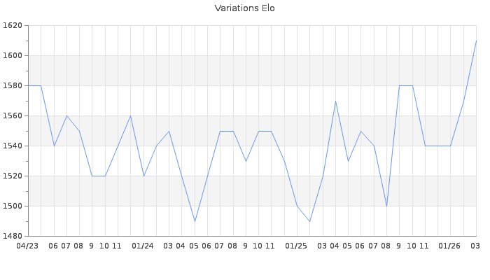 Date d'inscription : 31/03/20. Donateur pour EchecsEmail : Non ( Cliquez ici pour soutenir EchecsEmail. ) Elo non arrondi:1605.5 ( 313 sur 440 joueurs ) Nombre de victoires :430 Nombre de nulles :11 Nombre de défaites :473 Temps de réponse moyen par coup : 0J 4H 14M 23S ( Moyenne sur 1243 coups ). Rd ( Un petit rd indique un elo fiable ) : 57 Elo maximum atteint ( en étant classé ) :1710 Elo maximum atteint cette année :1610 Nombre coups joués : 30625 Inscrit dans l' équipe:La Diagonale du Fou Classement coupe : Inactif Points coupe : 0 Classement Coupe Magic Chess : Inactif Points Coupe Magic Chess : 0 Tournoi échelle : Inactif. Nombre de tournois gagnés :0