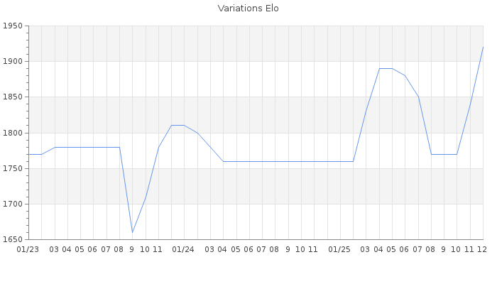 Date d'inscription : Avant le 20/12/05. Donateur pour EchecsEmail : Non ( Cliquez ici pour soutenir EchecsEmail. ) Elo non arrondi:1920.8 ( 165 sur 454 joueurs ) Nombre de victoires :972 Nombre de nulles :78 Nombre de défaites :809 Temps de réponse moyen par coup : 0J 2H 2M 7S ( Moyenne sur 860 coups ). Rd ( Un petit rd indique un elo fiable ) : 60 Magic Elo:1600 Magic Rd : 350 Elo maximum atteint ( en étant classé ) :1980 Elo maximum atteint cette année :1920 Nombre coups joués : 63157 Classement coupe : Inactif Points coupe : 0 Classement Coupe Magic Chess : Inactif Points Coupe Magic Chess : 0 Tournoi échelle : Inactif. Tournois gagnés : 14/12/2025 : Cat 3 : Victoire dans le tournoi n°27277 09/12/2025 : Cat 3 : Victoire dans le tournoi n°27256 06/12/2025 : Cat 3 : Victoire dans le tournoi n°27249 19/11/2025 : Cat 3 : Victoire dans le tournoi n°27204 08/08/2025 : Cat 3 : Victoire dans le tournoi n°26931 01/07/2025 : Cat 3 : Victoire dans le tournoi n°26851 18/05/2025 : Cat 3 : Victoire dans le tournoi n°26741 01/05/2025 : Cat 3 : Victoire dans le tournoi n°26708 24/04/2025 : Cat 3 : Victoire dans le tournoi n°26682 13/04/2025 : Cat 3 : Victoire dans le tournoi n°26636 10/12/2023 : Cat 3 : Victoire dans le tournoi n°25364 08/11/2023 : Cat 3 : Victoire dans le tournoi n°25306 16/10/2022 : Cat 3 : Victoire dans le tournoi n°24287 14/02/2022 : Cat 4 : Victoire dans le tournoi n°23527 01/01/2022 : Cat 4 : Victoire dans le tournoi n°23456 26/04/2021 : Cat 3 : Victoire dans le tournoi n°22662 21/03/2021 : Cat 3 : Victoire dans le tournoi n°22513 06/03/2021 : Cat 3 : Victoire dans le tournoi n°22501 01/03/2021 : Cat 3 : Victoire dans le tournoi n°22362 08/01/2021 : Cat 3 : Victoire dans le tournoi n°22265 04/01/2021 : Cat 3 : Victoire dans le tournoi n°22169 09/10/2020 : Cat 3 : Victoire dans le tournoi n°21740 31/07/2020 : Cat 3 : Victoire dans le tournoi n°21566 25/04/2020 : Cat 3 : Victoire dans le tournoi n°21129 02/04/2020 : Cat 3 : Victoire dans le tournoi n°21048 01/04/2020 : Cat 3 : Victoire dans le tournoi n°20978 21/03/2020 : Cat 3 : Victoire dans le tournoi n°20826 09/02/2020 : Cat 3 : Victoire dans le tournoi n°20725 18/10/2019 : Cat 3 : Victoire dans le tournoi n°20197 15/10/2019 : Cat 3 : Victoire dans le tournoi n°20261 19/09/2019 : Cat 3 : Victoire dans le tournoi n°20108 03/06/2019 : Cat 3 : Victoire dans le tournoi n°19590 25/09/2018 : Cat 3 : Victoire dans le tournoi n°18537 09/08/2018 : Cat 3 : Victoire dans le tournoi n°18312 27/06/2018 : Cat 3 : Victoire dans le tournoi n°18153 15/12/2017 : Cat 3 : Victoire dans le tournoi n°17346 31/01/2017 : Cat 3 : Victoire dans le tournoi n°16020 31/01/2017 : Cat 3 : Victoire dans le tournoi n°15664 09/01/2017 : Cat 3 : Victoire dans le tournoi n°15841 10/12/2016 : Cat 3 : Victoire dans le tournoi n°15477 02/10/2016 : Cat 3 : Victoire dans le tournoi n°15388 15/03/2016 : Cat 3 : Victoire dans le tournoi n°14481 29/02/2016 : Cat 3 : Victoire dans le tournoi n°14242 14/09/2015 : Cat 3 : Victoire dans le tournoi n°18257 04/12/2014 : Cat 3 : Victoire dans le tournoi n°16402 21/02/2014 : Cat 3 : Victoire dans le tournoi n°14635 07/02/2014 : Cat 3 : Victoire dans le tournoi n°14556 27/09/2013 : Cat 3 : Victoire dans le tournoi n°13472 11/08/2012 : Cat 4 : Victoire dans le tournoi n°10540 24/07/2012 : Cat 3 : Victoire dans le tournoi n°10389 22/11/2011 : Cat 3 : Victoire dans le tournoi n°9239 09/08/2011 : Cat 3 : Victoire dans le tournoi n°8594 14/05/2010 : Cat 4 : Victoire dans le tournoi n°7148 24/12/2009 : Cat 3 : Victoire dans le tournoi n°6366 27/11/2009 : Cat 3 : Victoire dans le tournoi n°6569 03/06/2009 : Cat 3 : Victoire dans le tournoi n°5891 02/01/2009 : Cat 3 : Victoire dans le tournoi n°5439 26/03/2008 : Cat 3 : Victoire dans le tournoi n°4657 28/01/2008 : Cat 3 : Victoire dans le tournoi n°4554 21/01/2008 : Cat 3 : Victoire dans le tournoi n°4575 27/10/2007 : Cat 2 : Victoire dans le tournoi n°4236 08/10/2007 : Cat 3 : Victoire dans le tournoi n°4245 31/05/2007 : Cat 1 : Victoire dans le tournoi n°3820 22/12/2006 : Cat 1 : Victoire dans le tournoi n°3537 18/06/2006 : Cat 1 : Victoire dans le tournoi n°2786 31/03/2006 : Cat 0 : Victoire dans le tournoi n°2636 Nombre de tournois gagnés :66