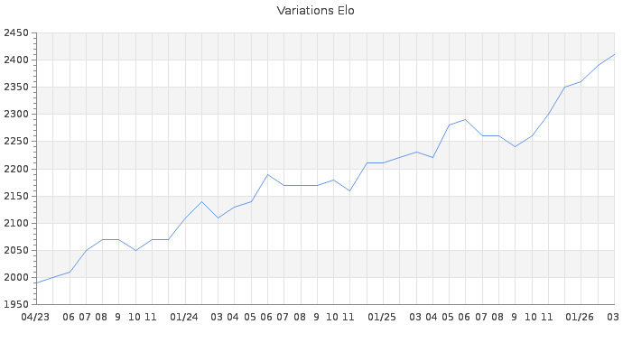 Date d'inscription : 07/06/07. Donateur pour EchecsEmail : Non ( Cliquez ici pour soutenir EchecsEmail. ) Elo non arrondi:2405.7 ( 37 sur 444 joueurs ) Nombre de victoires :557 Nombre de nulles :88 Nombre de défaites :298 Temps de réponse moyen par coup : 0J 14H 5M 7S ( Moyenne sur 171 coups ). Rd ( Un petit rd indique un elo fiable ) : 83 Magic Elo:1969.03 Magic Rd : 80 Elo maximum atteint ( en étant classé ) :2410 Elo maximum atteint cette année :2410 Nombre coups joués : 34354 Classement coupe : Inactif Points coupe : 0.18 Classement Coupe Magic Chess : Inactif Points Coupe Magic Chess : 0 Tournoi échelle : Inactif. Tournois gagnés : 09/01/2026 : Cat 5 : Victoire dans le tournoi n°27274 29/12/2025 : Cat 5 : Victoire dans le tournoi n°27180 01/12/2025 : Cat 5 : Victoire dans le tournoi n°27116 16/06/2025 : Cat 5 : Victoire dans le tournoi n°26762 18/05/2025 : Cat 5 : Victoire dans le tournoi n°26601 27/02/2025 : Cat 5 : Victoire dans le tournoi n°26331 31/12/2024 : Cat 5 : Victoire dans le tournoi n°26201 01/12/2024 : Cat 5 : Victoire dans le tournoi n°25922 07/07/2024 : Cat 5 : Victoire dans le tournoi n°25864 16/06/2024 : Cat 4 : Victoire dans le tournoi n°25793 09/06/2024 : Cat 5 : Victoire dans le tournoi n°25712 09/03/2024 : Cat 4 : Victoire dans le tournoi n°25522 26/01/2024 : Cat 4 : Victoire dans le tournoi n°25449 28/12/2023 : Cat 4 : Victoire dans le tournoi n°25375 09/10/2023 : Cat 4 : Victoire dans le tournoi n°25056 03/08/2023 : Cat 4 : Victoire dans le tournoi n°24989 02/07/2023 : Cat 4 : Victoire dans le tournoi n°24871 23/12/2022 : Cat 4 : Victoire dans le tournoi n°24347 23/09/2022 : Cat 4 : Victoire dans le tournoi n°23998 02/08/2022 : Cat 4 : Victoire dans le tournoi n°24059 13/02/2022 : Cat 4 : Victoire dans le tournoi n°23442 18/01/2022 : Cat 4 : Victoire dans le tournoi n°23403 20/12/2021 : Cat 4 : Victoire dans le tournoi n°23312 15/11/2021 : Cat 4 : Victoire dans le tournoi n°23253 15/10/2021 : Cat 3 : Victoire dans le tournoi n°23212 12/06/2018 : Cat 4 : Victoire dans le tournoi n°18022 14/02/2018 : Cat 4 : Victoire dans le tournoi n°17386 20/10/2017 : Cat 4 : Victoire dans le tournoi n°17070 08/10/2017 : Cat 4 : Victoire dans le tournoi n°16938 06/08/2016 : Cat 4 : Victoire dans le tournoi n°14627 21/02/2016 : Cat 4 : Victoire dans le tournoi n°14093 27/11/2015 : Cat 4 : Victoire dans le tournoi n°18373 13/09/2015 : Cat 5 : Victoire dans le tournoi n°17570 28/04/2015 : Cat 4 : Victoire dans le tournoi n°17366 12/04/2015 : Cat 4 : Victoire dans le tournoi n°16562 05/01/2015 : Cat 4 : Victoire dans le tournoi n°16703 08/08/2014 : Cat 3 : Victoire dans le tournoi n°15734 07/08/2014 : Cat 4 : Victoire dans le tournoi n°15733 20/07/2014 : Cat 3 : Victoire dans le tournoi n°15709 17/07/2014 : Cat 3 : Victoire dans le tournoi n°15639 08/10/2013 : Cat 3 : Victoire dans le tournoi n°13314 15/09/2013 : Cat 3 : Victoire dans le tournoi n°13132 25/11/2012 : Cat 3 : Victoire dans le tournoi n°11181 23/01/2010 : Cat 5 : Victoire dans le tournoi n°6721 17/06/2009 : Cat 4 : Victoire dans le tournoi n°5754 16/01/2009 : Cat 4 : Victoire dans le tournoi n°5441 28/09/2008 : Cat 4 : Victoire dans le tournoi n°5278 25/01/2008 : Cat 4 : Victoire dans le tournoi n°4440 23/11/2007 : Cat 4 : Victoire dans le tournoi n°4270 17/08/2007 : Cat 3 : Victoire dans le tournoi n°4256 Nombre de tournois gagnés :50