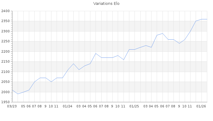 Date d'inscription : 07/06/07. Donateur pour EchecsEmail : Non ( Cliquez ici pour soutenir EchecsEmail. ) Elo non arrondi:2358.2 ( 40 sur 463 joueurs ) Nombre de victoires :554 Nombre de nulles :88 Nombre de défaites :298 Temps de réponse moyen par coup : 0J 11H 48M 55S ( Moyenne sur 201 coups ). Rd ( Un petit rd indique un elo fiable ) : 77 Magic Elo:1969.03 Magic Rd : 80 Elo maximum atteint ( en étant classé ) :2380 Elo maximum atteint cette année :2360 Nombre coups joués : 34238 Classement coupe : Inactif Points coupe : 0.18 Classement Coupe Magic Chess : Inactif Points Coupe Magic Chess : 0 Tournoi échelle : Inactif. Tournois gagnés : 09/01/2026 : Cat 5 : Victoire dans le tournoi n°27274 29/12/2025 : Cat 5 : Victoire dans le tournoi n°27180 01/12/2025 : Cat 5 : Victoire dans le tournoi n°27116 16/06/2025 : Cat 5 : Victoire dans le tournoi n°26762 18/05/2025 : Cat 5 : Victoire dans le tournoi n°26601 27/02/2025 : Cat 5 : Victoire dans le tournoi n°26331 31/12/2024 : Cat 5 : Victoire dans le tournoi n°26201 01/12/2024 : Cat 5 : Victoire dans le tournoi n°25922 07/07/2024 : Cat 5 : Victoire dans le tournoi n°25864 16/06/2024 : Cat 4 : Victoire dans le tournoi n°25793 09/06/2024 : Cat 5 : Victoire dans le tournoi n°25712 09/03/2024 : Cat 4 : Victoire dans le tournoi n°25522 26/01/2024 : Cat 4 : Victoire dans le tournoi n°25449 28/12/2023 : Cat 4 : Victoire dans le tournoi n°25375 09/10/2023 : Cat 4 : Victoire dans le tournoi n°25056 03/08/2023 : Cat 4 : Victoire dans le tournoi n°24989 02/07/2023 : Cat 4 : Victoire dans le tournoi n°24871 23/12/2022 : Cat 4 : Victoire dans le tournoi n°24347 23/09/2022 : Cat 4 : Victoire dans le tournoi n°23998 02/08/2022 : Cat 4 : Victoire dans le tournoi n°24059 13/02/2022 : Cat 4 : Victoire dans le tournoi n°23442 18/01/2022 : Cat 4 : Victoire dans le tournoi n°23403 20/12/2021 : Cat 4 : Victoire dans le tournoi n°23312 15/11/2021 : Cat 4 : Victoire dans le tournoi n°23253 15/10/2021 : Cat 3 : Victoire dans le tournoi n°23212 12/06/2018 : Cat 4 : Victoire dans le tournoi n°18022 14/02/2018 : Cat 4 : Victoire dans le tournoi n°17386 20/10/2017 : Cat 4 : Victoire dans le tournoi n°17070 08/10/2017 : Cat 4 : Victoire dans le tournoi n°16938 06/08/2016 : Cat 4 : Victoire dans le tournoi n°14627 21/02/2016 : Cat 4 : Victoire dans le tournoi n°14093 27/11/2015 : Cat 4 : Victoire dans le tournoi n°18373 13/09/2015 : Cat 5 : Victoire dans le tournoi n°17570 28/04/2015 : Cat 4 : Victoire dans le tournoi n°17366 12/04/2015 : Cat 4 : Victoire dans le tournoi n°16562 05/01/2015 : Cat 4 : Victoire dans le tournoi n°16703 08/08/2014 : Cat 3 : Victoire dans le tournoi n°15734 07/08/2014 : Cat 4 : Victoire dans le tournoi n°15733 20/07/2014 : Cat 3 : Victoire dans le tournoi n°15709 17/07/2014 : Cat 3 : Victoire dans le tournoi n°15639 08/10/2013 : Cat 3 : Victoire dans le tournoi n°13314 15/09/2013 : Cat 3 : Victoire dans le tournoi n°13132 25/11/2012 : Cat 3 : Victoire dans le tournoi n°11181 23/01/2010 : Cat 5 : Victoire dans le tournoi n°6721 17/06/2009 : Cat 4 : Victoire dans le tournoi n°5754 16/01/2009 : Cat 4 : Victoire dans le tournoi n°5441 28/09/2008 : Cat 4 : Victoire dans le tournoi n°5278 25/01/2008 : Cat 4 : Victoire dans le tournoi n°4440 23/11/2007 : Cat 4 : Victoire dans le tournoi n°4270 17/08/2007 : Cat 3 : Victoire dans le tournoi n°4256 Nombre de tournois gagnés :50