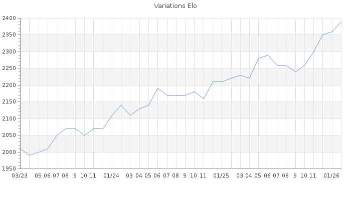 Date d'inscription : 07/06/07. Donateur pour EchecsEmail : Non ( Cliquez ici pour soutenir EchecsEmail. ) Elo non arrondi:2386.8 ( 34 sur 458 joueurs ) Nombre de victoires :556 Nombre de nulles :88 Nombre de défaites :298 Temps de réponse moyen par coup : 0J 11H 48M 56S ( Moyenne sur 190 coups ). Rd ( Un petit rd indique un elo fiable ) : 79 Magic Elo:1969.03 Magic Rd : 80 Elo maximum atteint ( en étant classé ) :2390 Elo maximum atteint cette année :2390 Nombre coups joués : 34248 Classement coupe : Inactif Points coupe : 0.18 Classement Coupe Magic Chess : Inactif Points Coupe Magic Chess : 0 Tournoi échelle : Inactif. Tournois gagnés : 09/01/2026 : Cat 5 : Victoire dans le tournoi n°27274 29/12/2025 : Cat 5 : Victoire dans le tournoi n°27180 01/12/2025 : Cat 5 : Victoire dans le tournoi n°27116 16/06/2025 : Cat 5 : Victoire dans le tournoi n°26762 18/05/2025 : Cat 5 : Victoire dans le tournoi n°26601 27/02/2025 : Cat 5 : Victoire dans le tournoi n°26331 31/12/2024 : Cat 5 : Victoire dans le tournoi n°26201 01/12/2024 : Cat 5 : Victoire dans le tournoi n°25922 07/07/2024 : Cat 5 : Victoire dans le tournoi n°25864 16/06/2024 : Cat 4 : Victoire dans le tournoi n°25793 09/06/2024 : Cat 5 : Victoire dans le tournoi n°25712 09/03/2024 : Cat 4 : Victoire dans le tournoi n°25522 26/01/2024 : Cat 4 : Victoire dans le tournoi n°25449 28/12/2023 : Cat 4 : Victoire dans le tournoi n°25375 09/10/2023 : Cat 4 : Victoire dans le tournoi n°25056 03/08/2023 : Cat 4 : Victoire dans le tournoi n°24989 02/07/2023 : Cat 4 : Victoire dans le tournoi n°24871 23/12/2022 : Cat 4 : Victoire dans le tournoi n°24347 23/09/2022 : Cat 4 : Victoire dans le tournoi n°23998 02/08/2022 : Cat 4 : Victoire dans le tournoi n°24059 13/02/2022 : Cat 4 : Victoire dans le tournoi n°23442 18/01/2022 : Cat 4 : Victoire dans le tournoi n°23403 20/12/2021 : Cat 4 : Victoire dans le tournoi n°23312 15/11/2021 : Cat 4 : Victoire dans le tournoi n°23253 15/10/2021 : Cat 3 : Victoire dans le tournoi n°23212 12/06/2018 : Cat 4 : Victoire dans le tournoi n°18022 14/02/2018 : Cat 4 : Victoire dans le tournoi n°17386 20/10/2017 : Cat 4 : Victoire dans le tournoi n°17070 08/10/2017 : Cat 4 : Victoire dans le tournoi n°16938 06/08/2016 : Cat 4 : Victoire dans le tournoi n°14627 21/02/2016 : Cat 4 : Victoire dans le tournoi n°14093 27/11/2015 : Cat 4 : Victoire dans le tournoi n°18373 13/09/2015 : Cat 5 : Victoire dans le tournoi n°17570 28/04/2015 : Cat 4 : Victoire dans le tournoi n°17366 12/04/2015 : Cat 4 : Victoire dans le tournoi n°16562 05/01/2015 : Cat 4 : Victoire dans le tournoi n°16703 08/08/2014 : Cat 3 : Victoire dans le tournoi n°15734 07/08/2014 : Cat 4 : Victoire dans le tournoi n°15733 20/07/2014 : Cat 3 : Victoire dans le tournoi n°15709 17/07/2014 : Cat 3 : Victoire dans le tournoi n°15639 08/10/2013 : Cat 3 : Victoire dans le tournoi n°13314 15/09/2013 : Cat 3 : Victoire dans le tournoi n°13132 25/11/2012 : Cat 3 : Victoire dans le tournoi n°11181 23/01/2010 : Cat 5 : Victoire dans le tournoi n°6721 17/06/2009 : Cat 4 : Victoire dans le tournoi n°5754 16/01/2009 : Cat 4 : Victoire dans le tournoi n°5441 28/09/2008 : Cat 4 : Victoire dans le tournoi n°5278 25/01/2008 : Cat 4 : Victoire dans le tournoi n°4440 23/11/2007 : Cat 4 : Victoire dans le tournoi n°4270 17/08/2007 : Cat 3 : Victoire dans le tournoi n°4256 Nombre de tournois gagnés :50