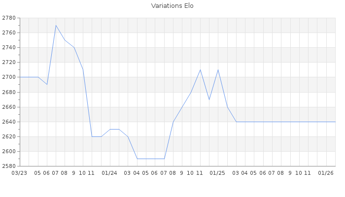 Date d'inscription : 22/04/07. Donateur pour EchecsEmail : Non ( Cliquez ici pour soutenir EchecsEmail. ) Elo non arrondi:2609 ( 21 sur 456 joueurs ) Nombre de victoires :864 Nombre de nulles :361 Nombre de défaites :622 Temps de réponse moyen par coup : 0J 7H 50M 6S ( Moyenne sur 1 coups ). Rd ( Un petit rd indique un elo fiable ) : 91 Magic Elo:1600 Magic Rd : 350 Elo maximum atteint ( en étant classé ) :2790 Elo maximum atteint cette année :0 Nombre coups joués : 56202 Inscrit dans l' équipe:Royal Kids Classement coupe : Inactif, date de la dernière qualification : 07/03/24 Points coupe : 3727.72 Classement Coupe Magic Chess : Inactif Points Coupe Magic Chess : 0 Tournoi échelle : Inactif. Tournois gagnés : 21/07/2020 : Cat 7 : Victoire dans le tournoi n°21157 11/11/2016 : Cat 6 : Victoire dans le tournoi n°15256 11/02/2016 : Cat 6 : Victoire dans le tournoi n°18541 24/05/2015 : Cat 6 : Victoire dans le tournoi n°16144 06/01/2014 : Cat 5 : Victoire dans le tournoi n°13718 18/12/2013 : Cat 5 : Victoire dans le tournoi n°13092 16/03/2012 : Cat 4 : Victoire dans le tournoi n°9866 28/02/2012 : Cat 4 : Victoire dans le tournoi n°9835 19/02/2012 : Cat 4 : Victoire dans le tournoi n°9864 02/06/2010 : Cat 4 : Victoire dans le tournoi n°7242 24/08/2008 : Cat 5 : Victoire dans le tournoi n°4810 22/05/2007 : Cat 3 : Victoire dans le tournoi n°3793 15/05/2007 : Cat 3 : Victoire dans le tournoi n°3786 10/12/2006 : Cat 3 : Victoire dans le tournoi n°3193 15/10/2006 : Cat 2 : Victoire dans le tournoi n°3110 13/08/2006 : Cat 2 : Victoire dans le tournoi n°3131 11/04/2006 : Cat 3 : Victoire dans le tournoi n°2603 07/04/2006 : Cat 3 : Victoire dans le tournoi n°1976 20/10/2005 : Cat 3 : Victoire dans le tournoi n°1932 13/09/2005 : Cat 2 : Victoire dans le tournoi n°1909 Nombre de tournois gagnés :20