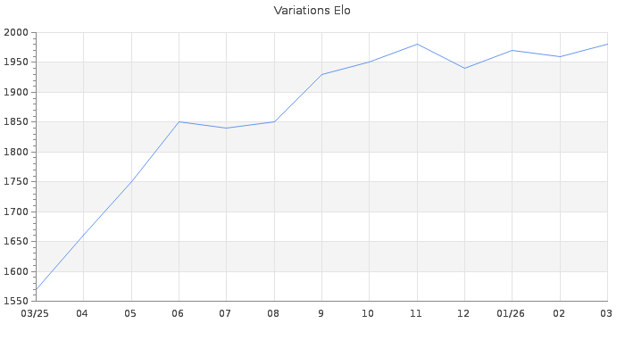 Date d'inscription : 05/03/25. Donateur pour EchecsEmail : Non ( Cliquez ici pour soutenir EchecsEmail. ) Elo non arrondi:1978.8 ( 137 sur 441 joueurs ) Nombre de victoires :70 Nombre de nulles :18 Nombre de défaites :13 Temps de réponse moyen par coup : 1J 2H 52M 16S ( Moyenne sur 612 coups ). Rd ( Un petit rd indique un elo fiable ) : 64 Elo maximum atteint ( en étant classé ) :2010 Elo maximum atteint cette année :2010 Nombre coups joués : 3031 Classement coupe : Inactif, date de la dernière qualification : 11/03/25 Points coupe : 11.28 Classement Coupe Magic Chess : Inactif Points Coupe Magic Chess : 0 Tournoi échelle : Inactif. Tournois gagnés : 04/12/2025 : Cat 4 : Victoire dans le tournoi n°27107 20/06/2025 : Cat 2 : Victoire dans le tournoi n°26551 12/06/2025 : Cat 1 : Victoire dans le tournoi n°26500 Nombre de tournois gagnés :3