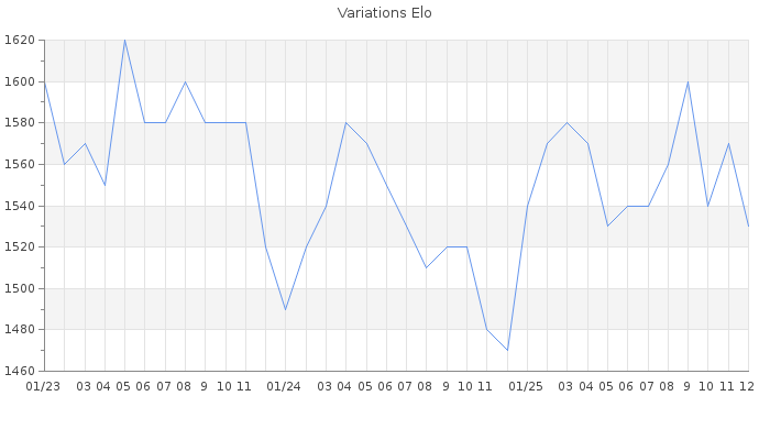 Date d'inscription : 15/02/21. Donateur pour EchecsEmail : Non ( Cliquez ici pour soutenir EchecsEmail. ) Elo non arrondi:1532.1 ( 352 sur 449 joueurs ) Nombre de victoires :873 Nombre de nulles :78 Nombre de défaites :1007 Temps de réponse moyen par coup : 0J 2H 22M 16S ( Moyenne sur 2800 coups ). Rd ( Un petit rd indique un elo fiable ) : 52 Magic Elo:1700 Magic Rd : 350 Elo maximum atteint ( en étant classé ) :1640 Elo maximum atteint cette année :1620 Nombre coups joués : 73460 Classement coupe : Inactif Points coupe : 0 Classement Coupe Magic Chess : Inactif Points Coupe Magic Chess : 0 Tournoi échelle : Tournois gagnés : 29/11/2025 : Cat 2 : Victoire dans le tournoi n°27245 28/11/2025 : Cat 2 : Victoire dans le tournoi n°27236 06/10/2025 : Cat 2 : Victoire dans le tournoi n°27079 21/09/2025 : Cat 2 : Victoire dans le tournoi n°27052 14/08/2025 : Cat 1 : Victoire dans le tournoi n°26777 13/08/2025 : Cat 2 : Victoire dans le tournoi n°26971 25/07/2025 : Cat 2 : Victoire dans le tournoi n°26844 13/03/2025 : Cat 2 : Victoire dans le tournoi n°26493 12/03/2025 : Cat 2 : Victoire dans le tournoi n°26563 29/01/2025 : Cat 2 : Victoire dans le tournoi n°26447 13/01/2025 : Cat 1 : Victoire dans le tournoi n°26404 14/12/2024 : Cat 2 : Victoire dans le tournoi n°26188 30/06/2024 : Cat 2 : Victoire dans le tournoi n°25848 26/05/2024 : Cat 2 : Victoire dans le tournoi n°25812 13/03/2024 : Cat 2 : Victoire dans le tournoi n°25658 22/10/2023 : Cat 2 : Victoire dans le tournoi n°25227 10/10/2023 : Cat 2 : Victoire dans le tournoi n°25177 09/09/2023 : Cat 2 : Victoire dans le tournoi n°25134 04/09/2023 : Cat 2 : Victoire dans le tournoi n°25101 10/08/2023 : Cat 2 : Victoire dans le tournoi n°25087 29/06/2023 : Cat 2 : Victoire dans le tournoi n°24897 02/06/2023 : Cat 2 : Victoire dans le tournoi n°24936 12/05/2023 : Cat 2 : Victoire dans le tournoi n°24876 24/04/2023 : Cat 2 : Victoire dans le tournoi n°24735 09/03/2023 : Cat 2 : Victoire dans le tournoi n°24709 21/02/2023 : Cat 2 : Victoire dans le tournoi n°24640 11/01/2023 : Cat 2 : Victoire dans le tournoi n°24552 14/12/2022 : Cat 2 : Victoire dans le tournoi n°24479 11/12/2022 : Cat 2 : Victoire dans le tournoi n°24444 03/11/2022 : Cat 2 : Victoire dans le tournoi n°24292 13/07/2022 : Cat 2 : Victoire dans le tournoi n°24057 10/07/2022 : Cat 2 : Victoire dans le tournoi n°24019 22/06/2022 : Cat 2 : Victoire dans le tournoi n°23993 30/05/2022 : Cat 2 : Victoire dans le tournoi n°23932 12/03/2022 : Cat 2 : Victoire dans le tournoi n°23674 07/02/2022 : Cat 2 : Victoire dans le tournoi n°23568 01/02/2022 : Cat 2 : Victoire dans le tournoi n°23582 25/11/2021 : Cat 2 : Victoire dans le tournoi n°23324 08/11/2021 : Cat 2 : Victoire dans le tournoi n°23299 04/11/2021 : Cat 2 : Victoire dans le tournoi n°23275 25/10/2021 : Cat 2 : Victoire dans le tournoi n°23173 15/09/2021 : Cat 2 : Victoire dans le tournoi n°23137 13/07/2021 : Cat 1 : Victoire dans le tournoi n°22802 Nombre de tournois gagnés :43
