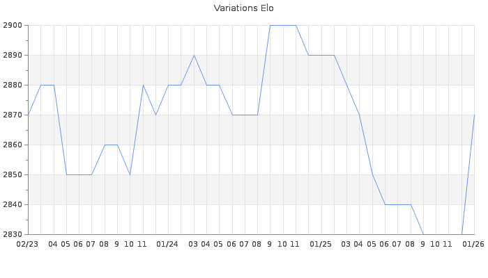 Date d'inscription : 08/07/12. Donateur pour EchecsEmail : Oui ( Cliquez ici pour soutenir EchecsEmail. ) Elo non arrondi:2870.7 ( 1 sur 462 joueurs ) Nombre de victoires :227 Nombre de nulles :205 Nombre de défaites :16 Temps de réponse moyen par coup : 0J 5H 30M 40S ( Moyenne sur 189 coups ). Rd ( Un petit rd indique un elo fiable ) : 92 Magic Elo:1600 Magic Rd : 350 Elo maximum atteint ( en étant classé ) :2980 Elo maximum atteint cette année :2870 Nombre coups joués : 17184 Inscrit dans l' équipe:Les Rois du Succes Classement coupe : Inactif, date de la dernière qualification : 19/05/22 Points coupe : 610.58 Classement Coupe Magic Chess : Inactif Points Coupe Magic Chess : 0 Tournoi échelle : Inactif. Tournois gagnés : 26/04/2020 : Cat 7 : Victoire CC Nov19 Asc 19/11/2019 : Cat 9 : Victoire CC Automne 2018 28/01/2019 : Cat 8 : Victoire CC Oct18 03/04/2015 : Cat 7 : Victoire dans le tournoi n°16677 26/03/2013 : Cat 6 : Victoire dans le tournoi n°11333 27/11/2012 : Cat 6 : Victoire dans le tournoi n°10772 Nombre de tournois gagnés :6