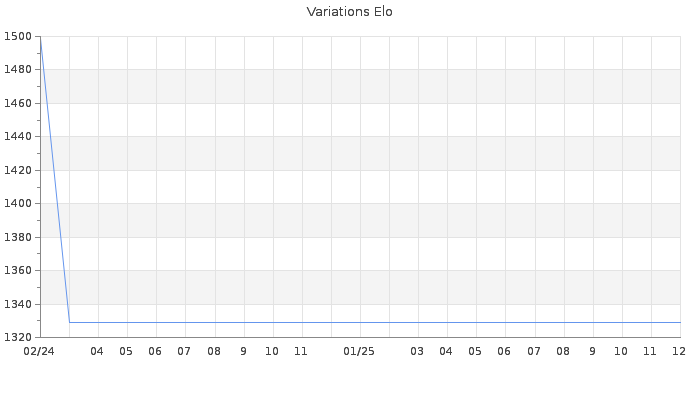 Date d'inscription : 28/02/24. Donateur pour EchecsEmail : Non ( Cliquez ici pour soutenir EchecsEmail. ) Elo non arrondi:1297.5 ( 478 sur 459 joueurs ) Nombre de victoires :0 Nombre de nulles :0 Nombre de défaites :2 Temps de réponse moyen par coup : 0J 0H 33M 0S ( Moyenne sur 0 coups ). Rd ( Un petit rd indique un elo fiable ) : 222 Elo maximum atteint ( en étant classé ) :0 Elo maximum atteint cette année :0 Nombre coups joués : 25 Classement coupe : Inactif Points coupe : 0 Classement Coupe Magic Chess : Inactif Points Coupe Magic Chess : 0 Tournoi échelle : Nombre de tournois gagnés :0
